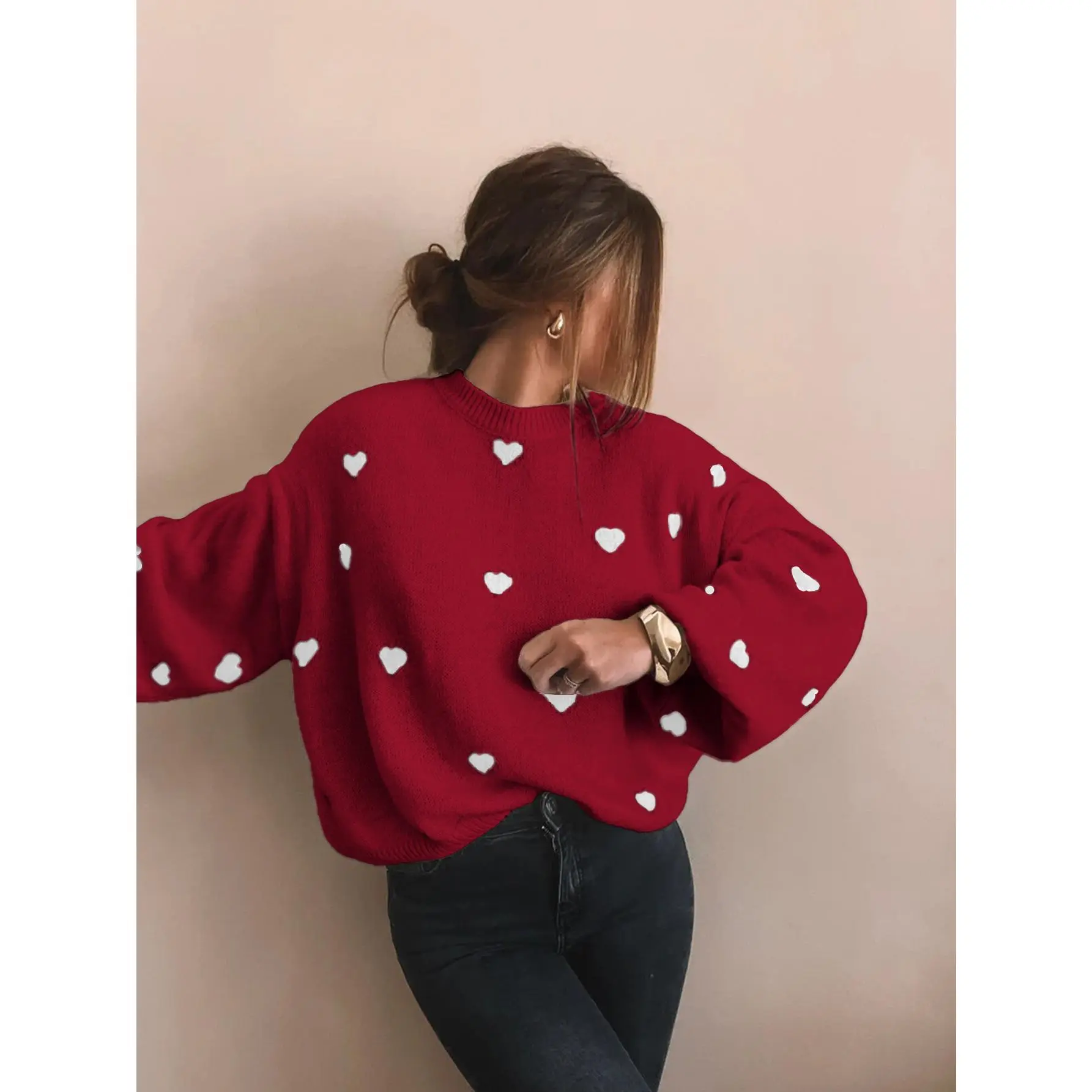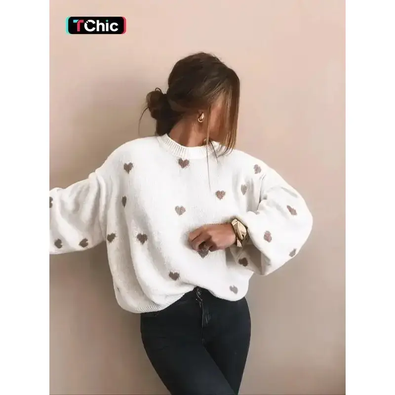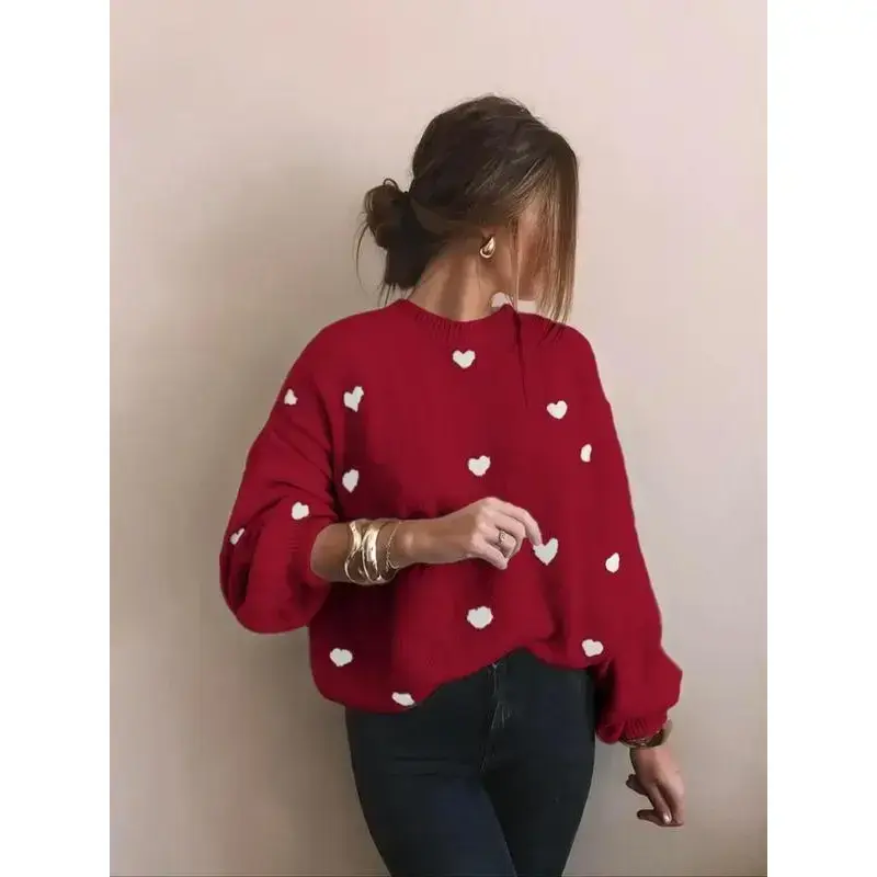 Women's full heart-shaped printed off shoulder sweater, autumn and winter casual long sleeved round neck sweater, fashionable women's knitted daily wear, women's clothing