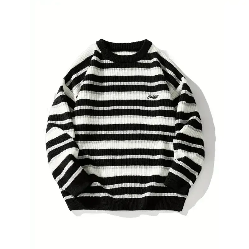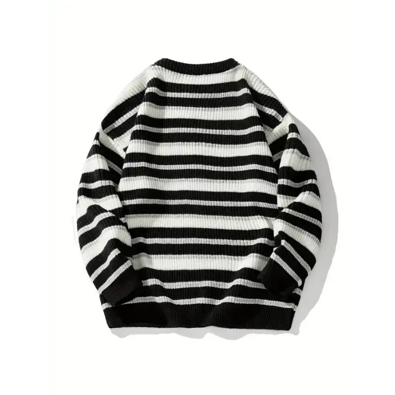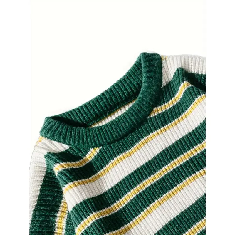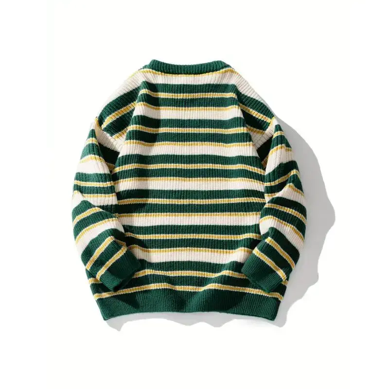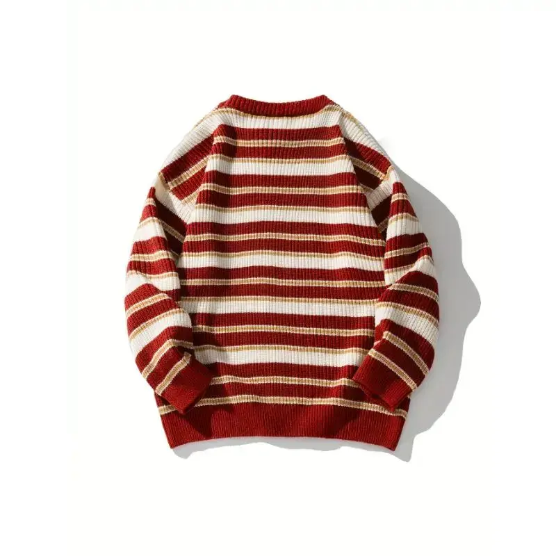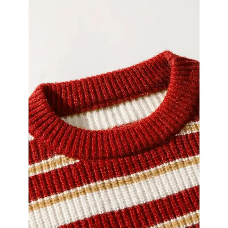 Men'S Christmas Striped Chunky Knit Sweater, Vintage Color Block Japanese Style, Casual Round Neck, Polyester, Regular Length, Long Sleeves, Loose Fit, Knitted Fabric Collar Knitwear Menswear Stretch Tops Knife Crewneck