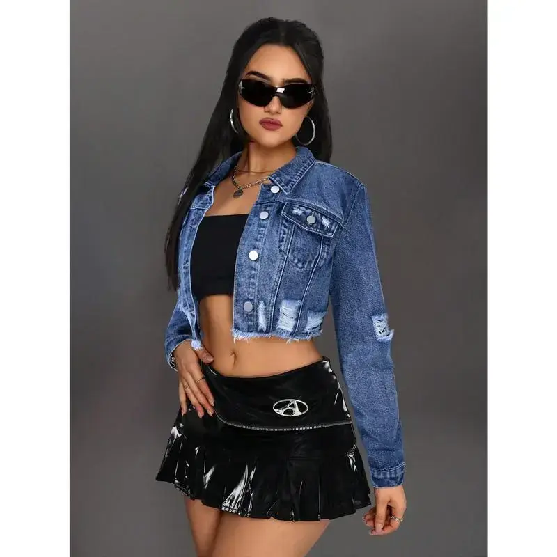 Cropped Denim Jacket, Casual & Fashionable For Everyday Wear Tops Fit Long Sleeve