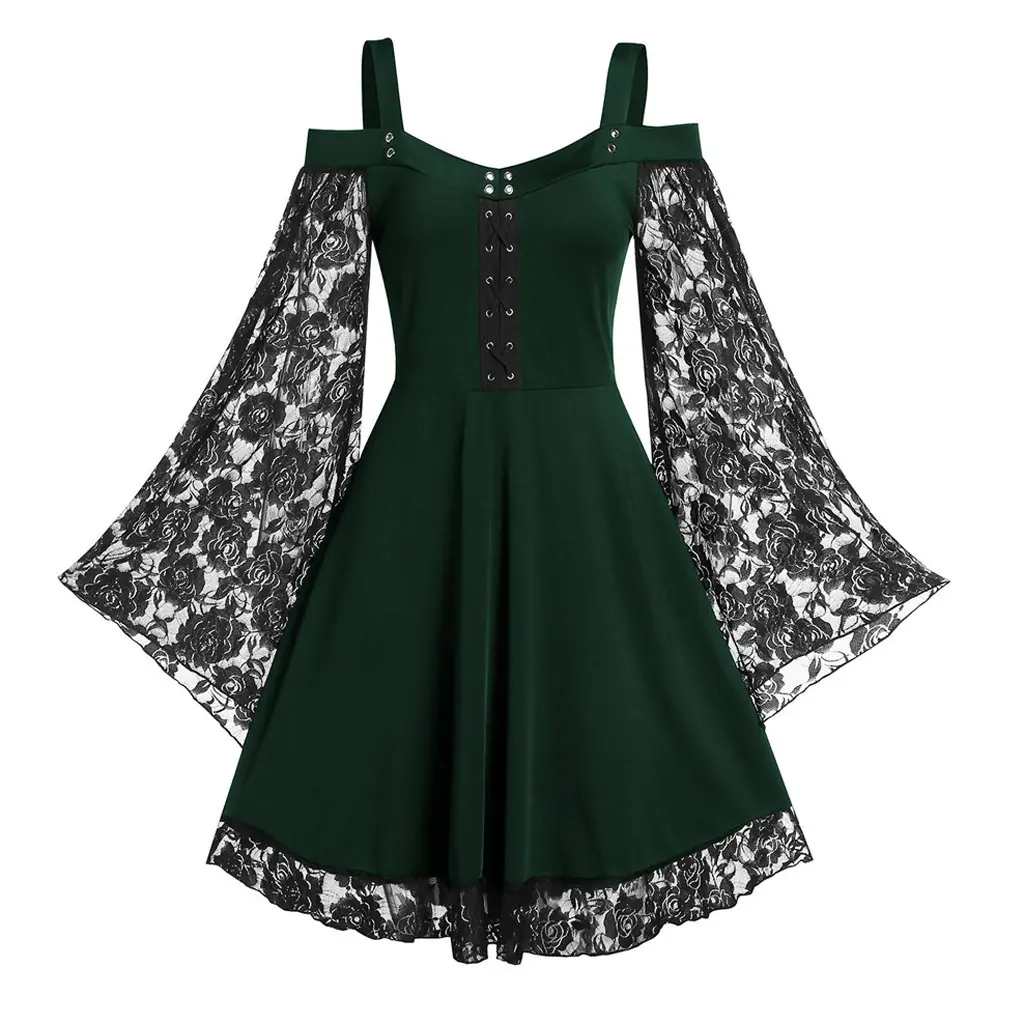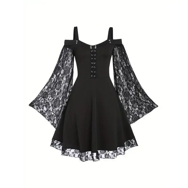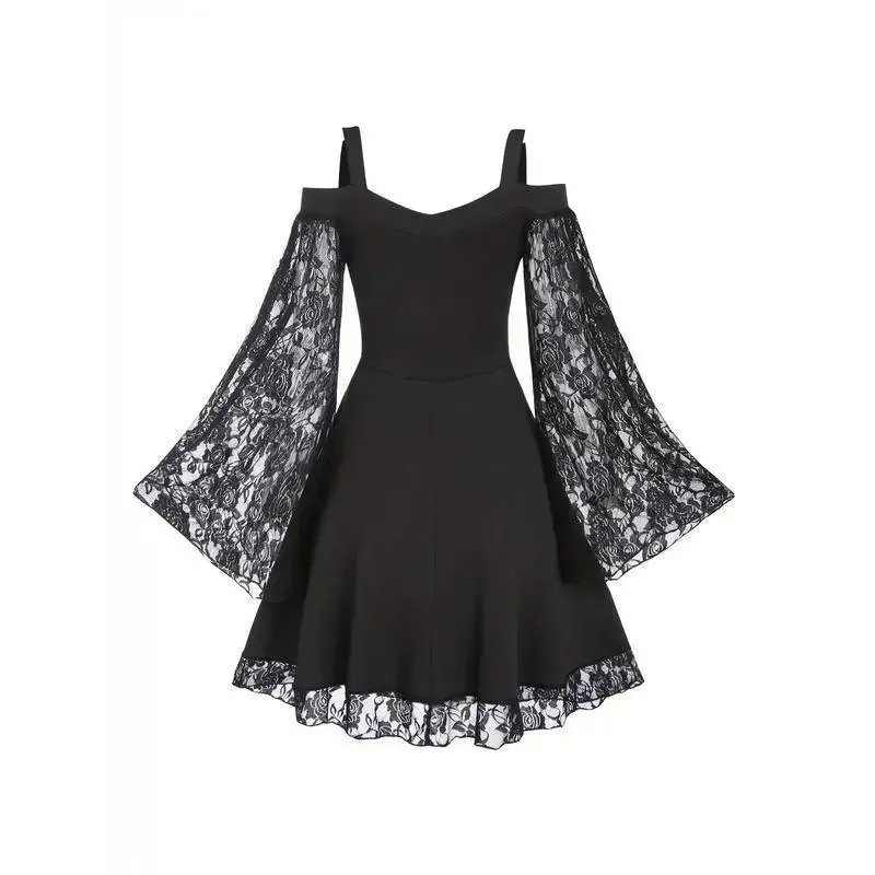 Elegant Gothic Bell Sleeve Dress with Floral Lace Detailing, Black A-Line Mini Dress for Women - Off-Shoulder Design, Polyester, Machine Washable