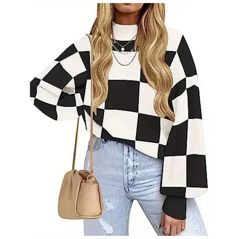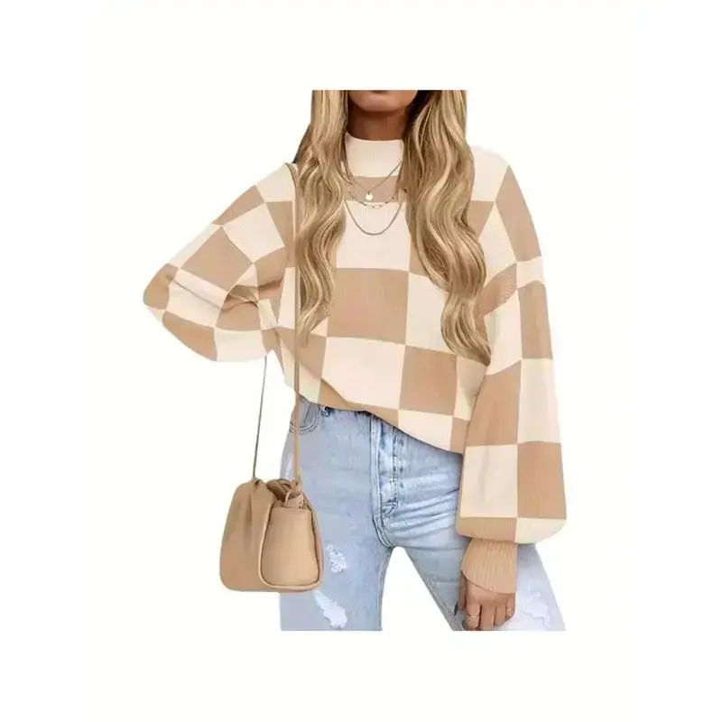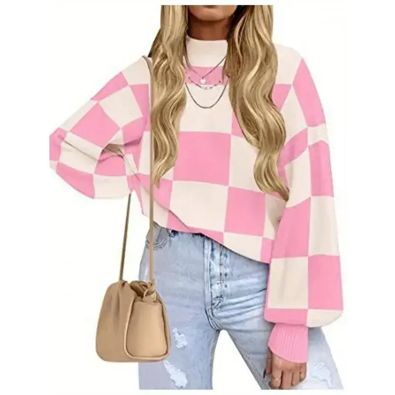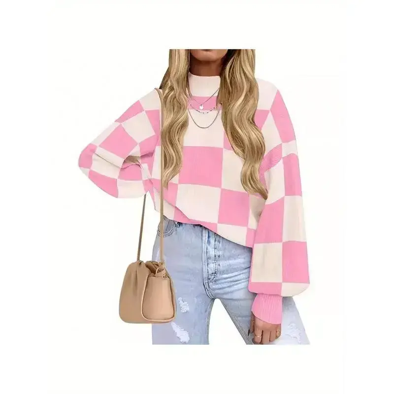 Women's 2025 Checkered Color Block Sweater ? Trendy & Eye-Catching Design ? Multi-color checkered blocks in options like orange-pink, black-white, pink-white, and beige-tan create high-recognition looks. These rich visual layers fit various fashion styles, making it a standout piece. Comfortable & Practical Fit The high neck design keeps you warm and slims the face. The loose cut suits all body types, ensuring no restriction and a relaxed vibe. It offers comfort and a slim effect, perfect for fall/winter. Versatile for Various Scenarios Made of soft, skin-friendly knitted fabric, this sweater is warm and practical. It can be worn alone in spring/autumn or layered in winter. Ideal for daily casual wear, friend gatherings, and light office commutes. Product Details