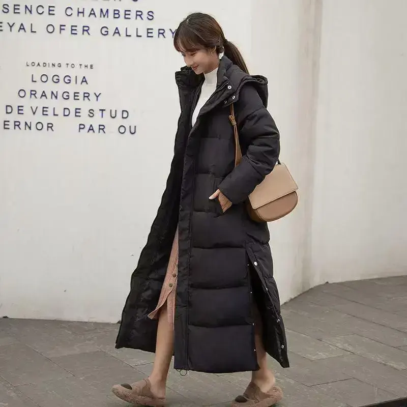 Extra Long Double Zipper Hooded Down Cotton Jacket for Women, Thickened and Warm Winter Coat, Waterproof Casual Fabric