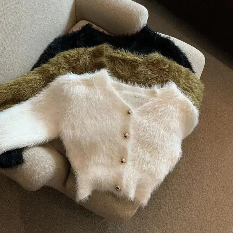 Vintage Cropped Mohair Knitted Cardigan Women V Neck Sweater Coat Streetwear Korean Black White Knitwear Solid Slim Jumpers New