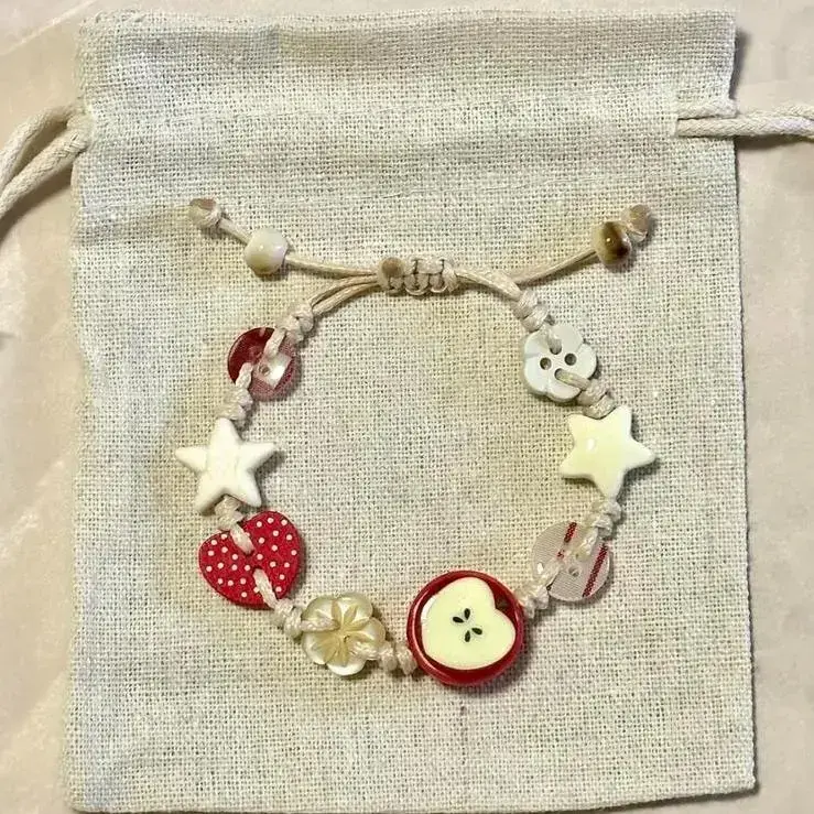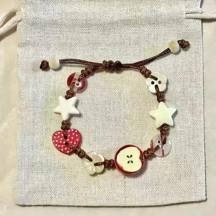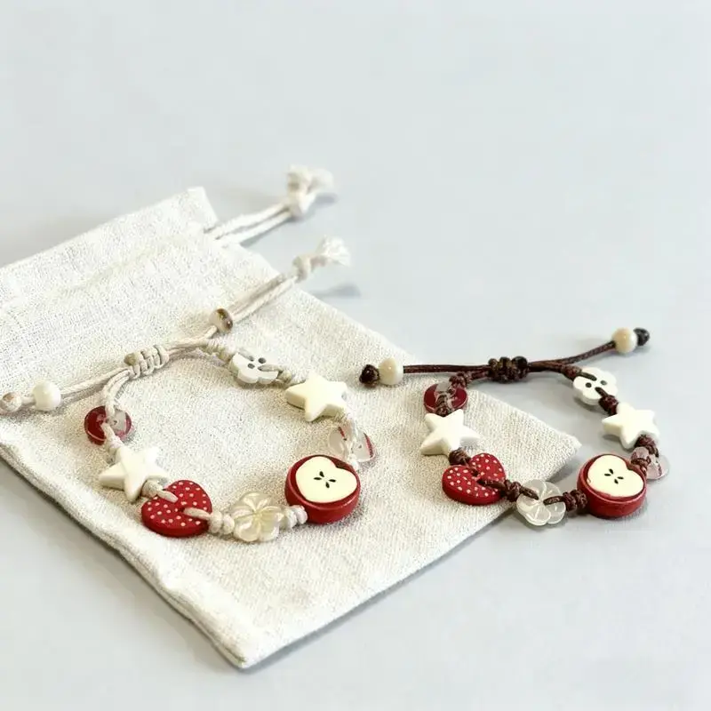 Each bracelet features a delicately crafted apple charm paired with cute star accents, showcasing exquisite craftsmanship and a touch of creativity. ??Natural Materials: Made from high-quality wood beads and durable woven cord, this bracelet is lightweight, comfortable, and suitable for daily wear all year round. ?Adjustable Fit: The bracelet measures 15 cm when folded and can be easily adjusted to fit most wrist sizes - perfect for both women and teens. ??Vintage & Elegant Style: Combines boho and vintage charm with a fresh, summery vibe, making it an ideal accessory for casual outfits, beach days, or special occasions. ??Perfect Gift choice: A meaningful handmade bracelet that makes a thoughtful gift for birthdays, holidays, or friendship celebrations - elegant and unique. ??Product Details: Material: Wood + Woven Cord Length: 15 cm (folded, adjustable) Style: Handmade / Boho / Vintage Gender: Women & Teens Closure: Adjustable Resin Button