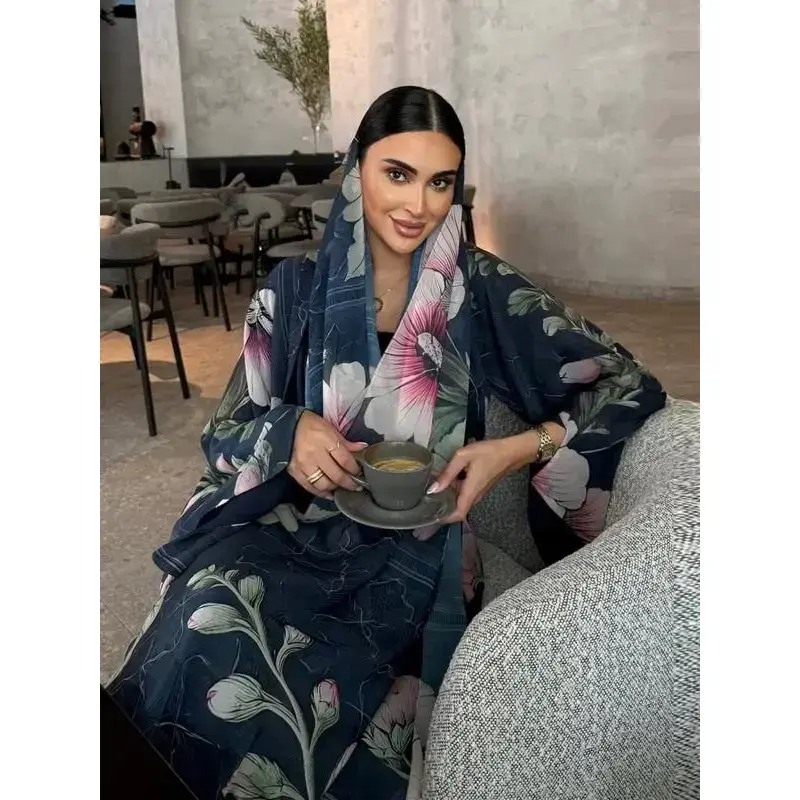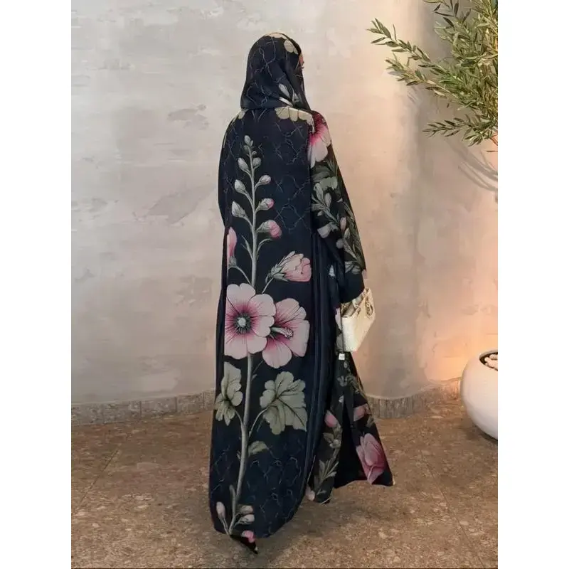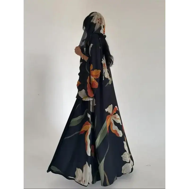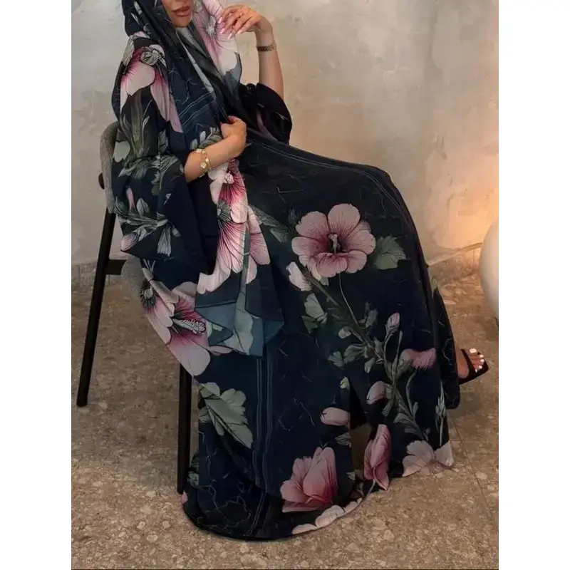 Women's Elegant Modest Islamic Two-Piece Set with Scarf, Open-Print Long Robe, Loose-Fit Woven Fabric, All Seasons Fashionable Clothing, Abaya Hijab Set