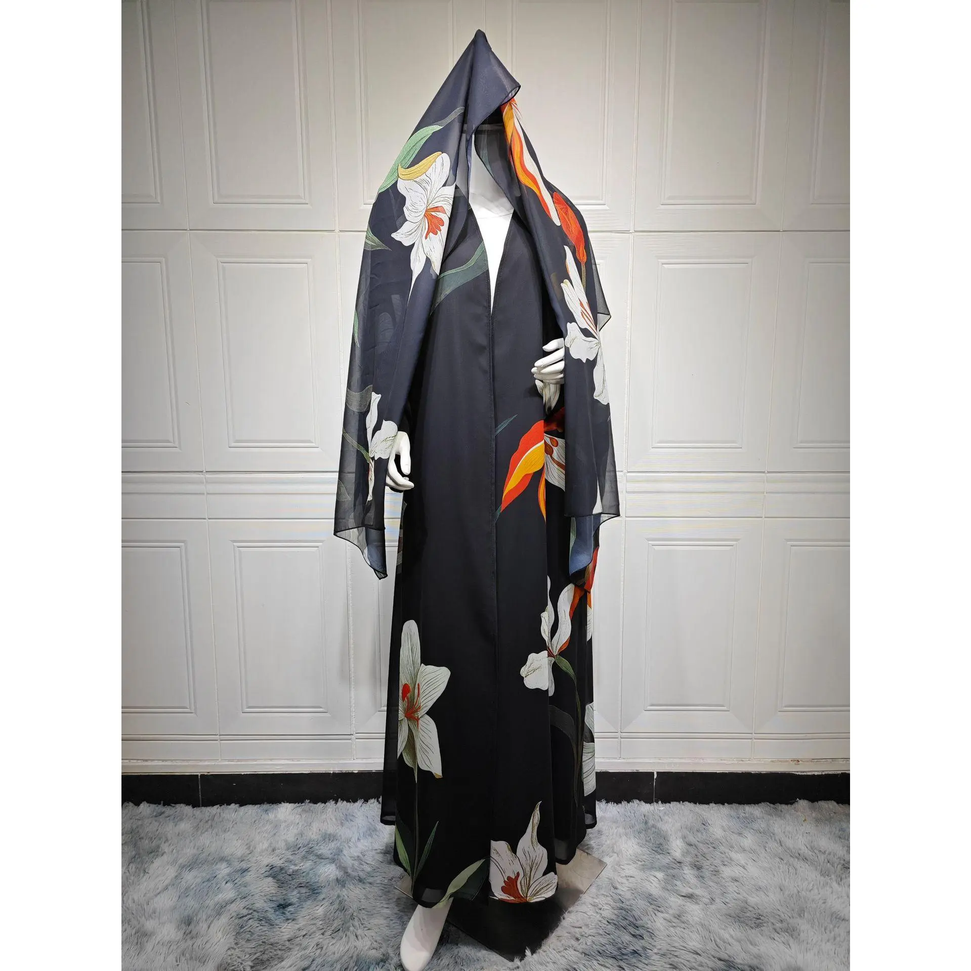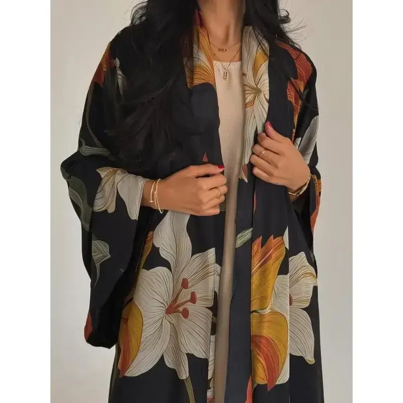 ??Two-piece Set??: Includes a matching scarf, offering a coordinated look that enhances the overall aesthetic of the outfit. ??Floral Patterns??: Features all-over floral and geometric prints, providing a vibrant and refreshing visual appeal suitable for any occasion. ??Lightweight Fabric??: Crafted from thin woven fabric, ensuring breathability and ease of wear throughout all seasons. ??Loose Fit??: Designed with a loose-fitting silhouette, allowing for unrestricted movement and a relaxed wearing experience. ??Open Style??: Constructed as an open robe, facilitating easy layering over various outfits, enhancing versatility in wear.