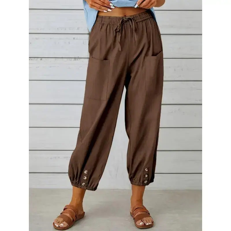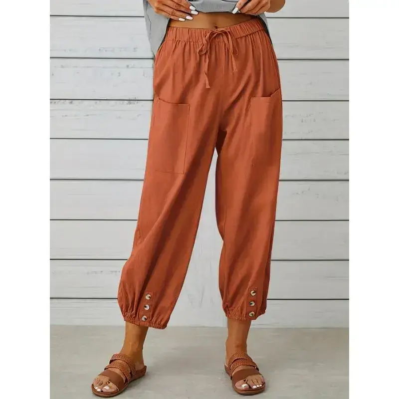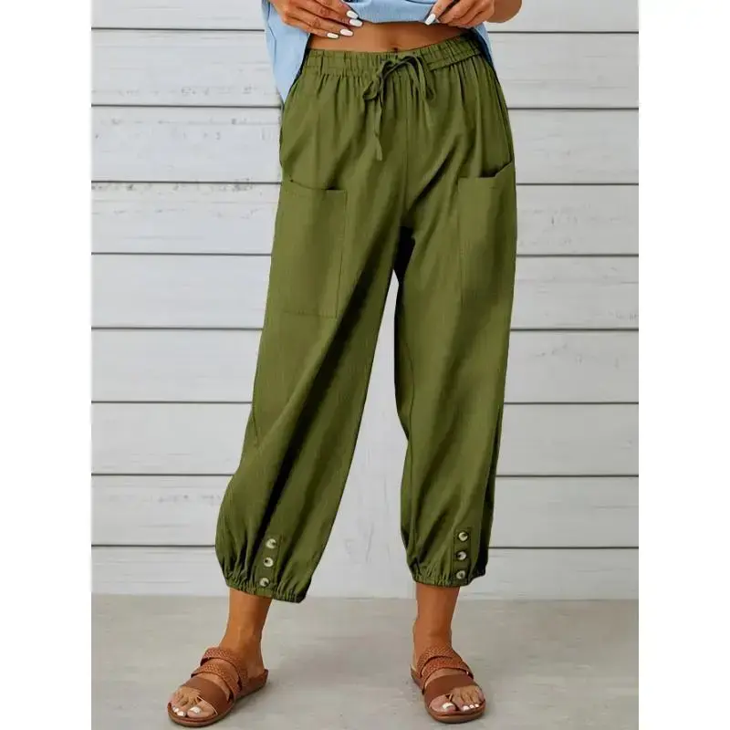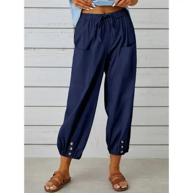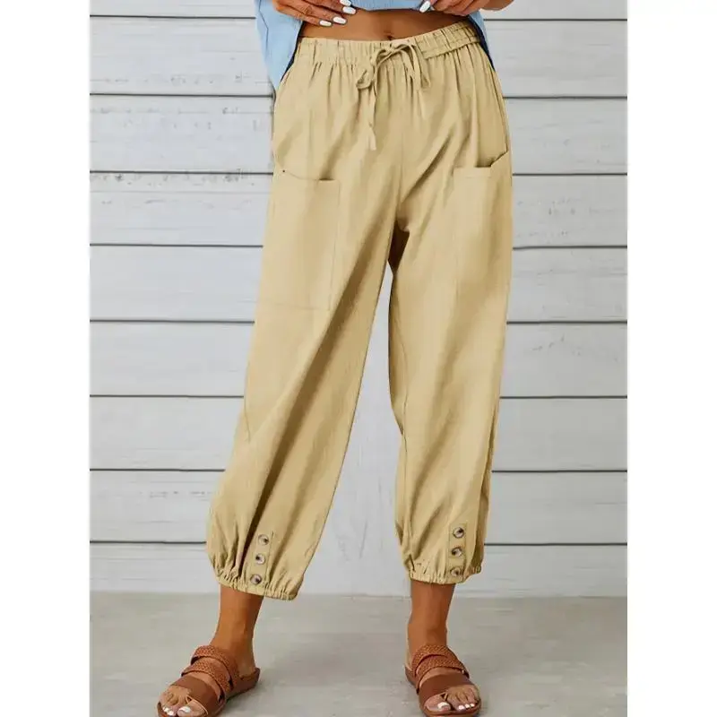 Composition:100% Polyester/Material:Polyester/Details:Fake Buttons/Pattern:Solid color/Applicable People:Adult/Sheer:No/Type:Tapered/Carrot/Season:All-season/Operation Instruction:Machine wash, do not dry clean/Style:Vacation/Fabric Elasticity:No Elasticity/Printing Type:No Printing/Weaving Method:Woven/Item ID:DM06960/Origin:Guangdong,China