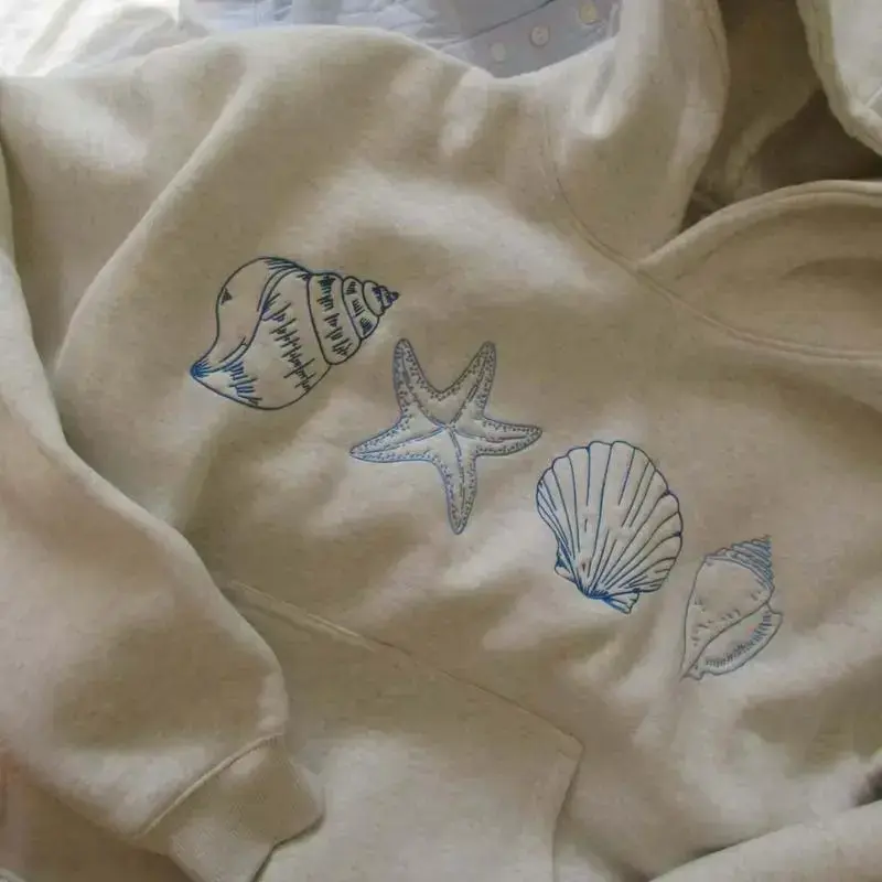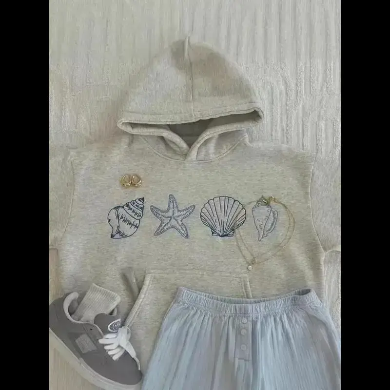 Women's Cozy Grey Hoodie with Marine-Themed Starfish Crew Neck Long Sleeve Casual Sweatshirt CN1261232 - Fabric Pullover Loose Winter Cotton Fit Womenswear Tops