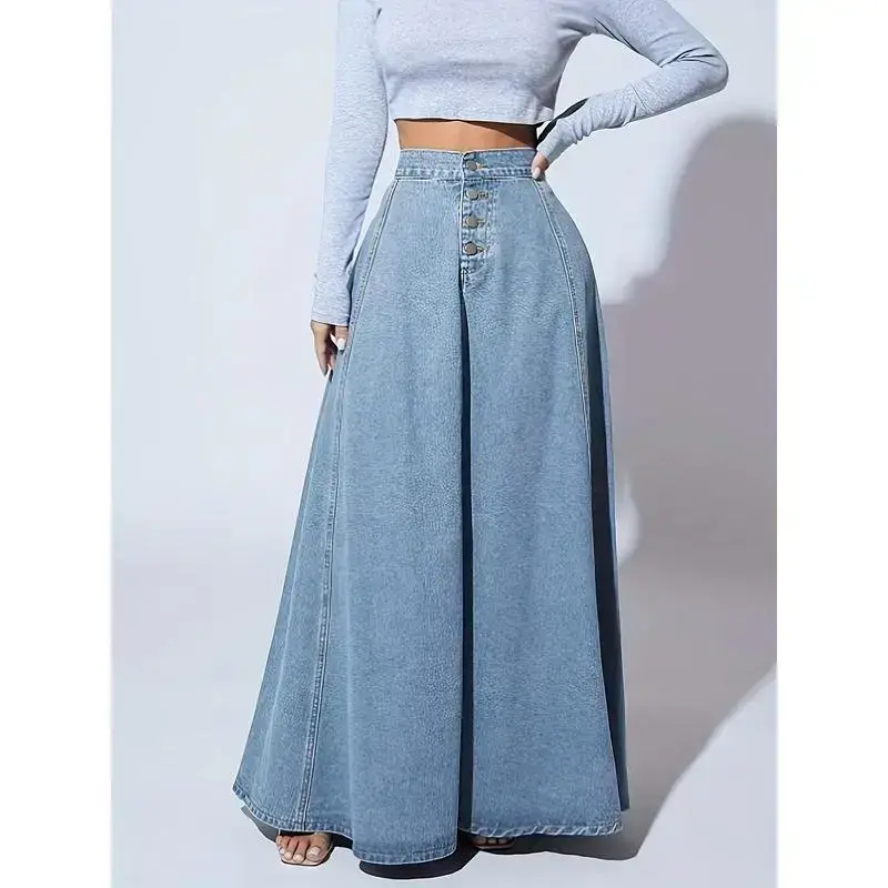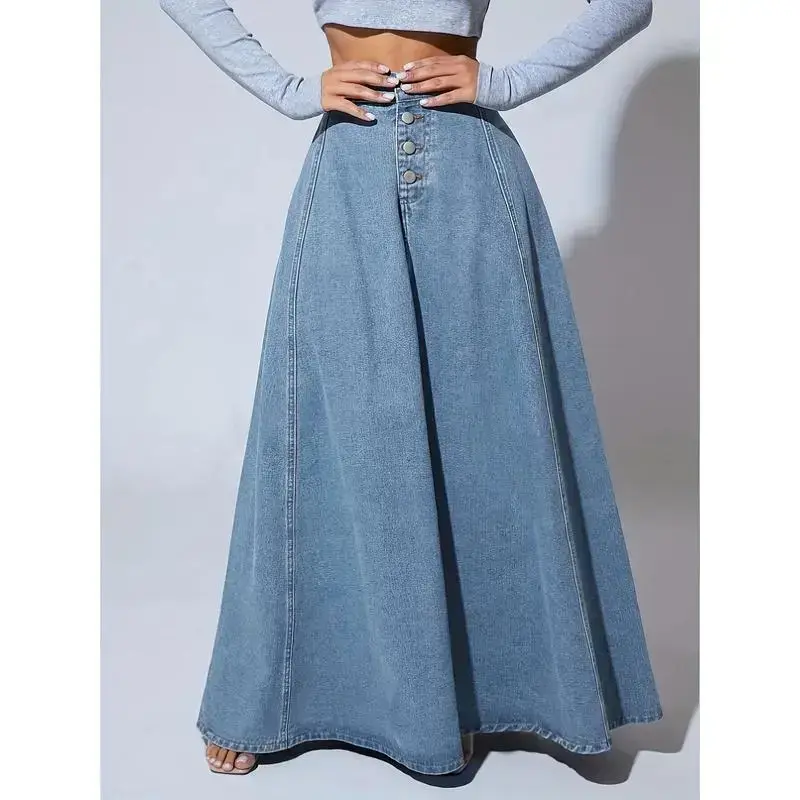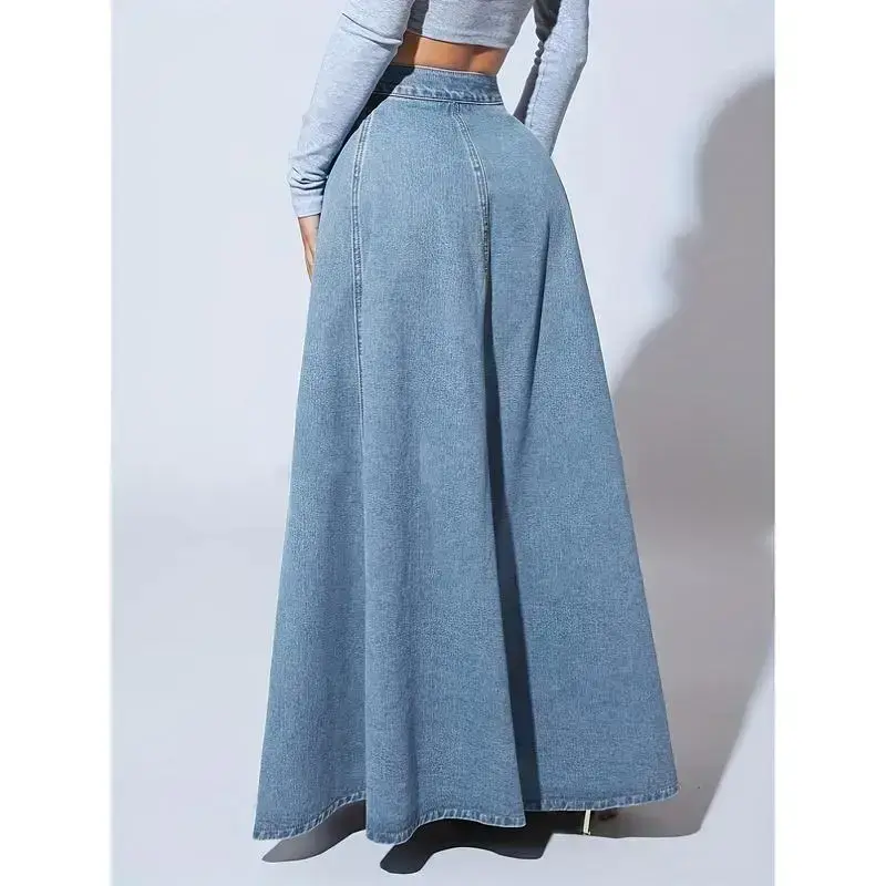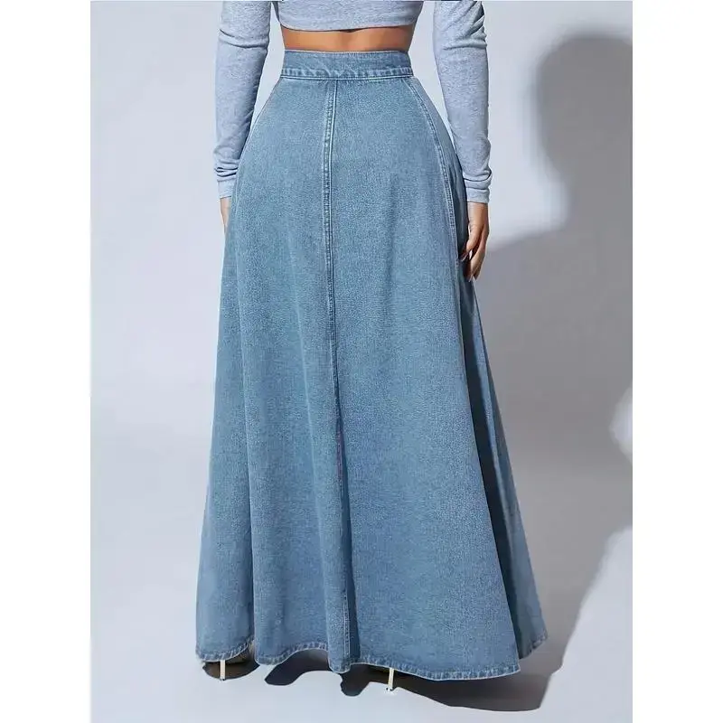 Plain Light Washed Blue Single-breasted Loose Fit Maxi Flare Denim Skirt, Women's Denim Jeans & Clothing