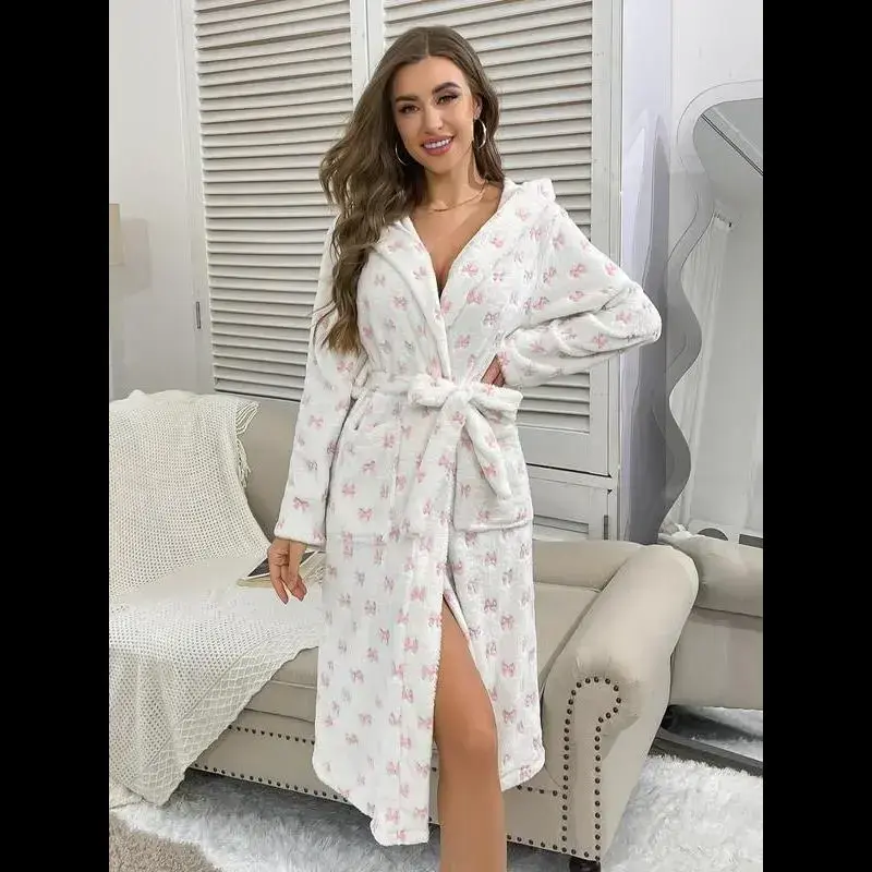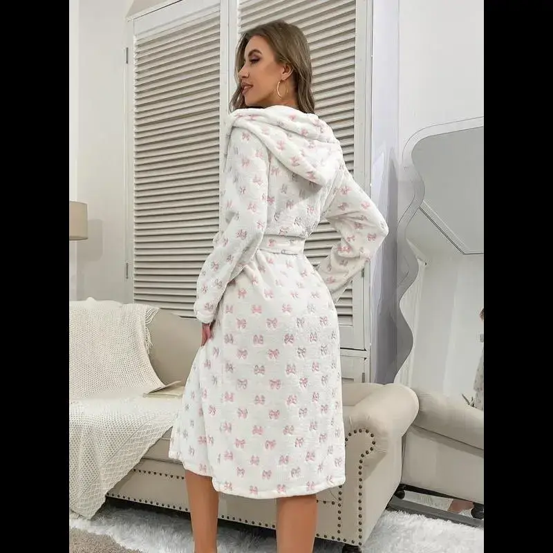 Women's Full Body Butterfly Knot Long Sleeve Nightgown, Soft and Comfortable, with Small Pockets on Both Sides. Same Style Waist Belt, Plush Hood, Thick Robe. Autumn and Winter Styles, Plush Warm Home Clothes, Outdoor Casual Pajamas, Housecoat