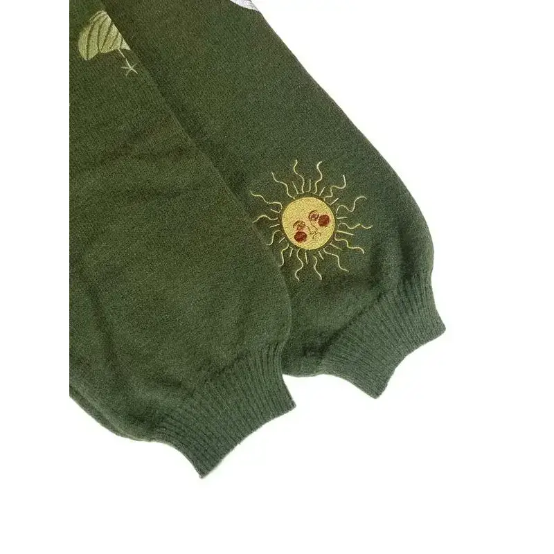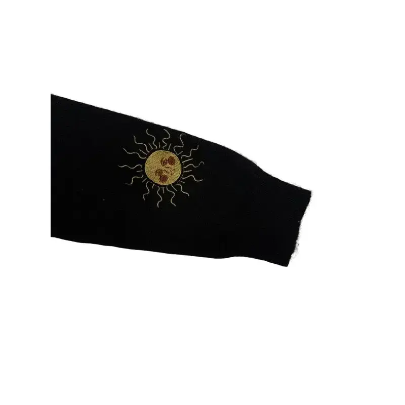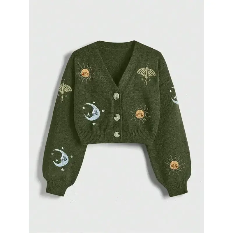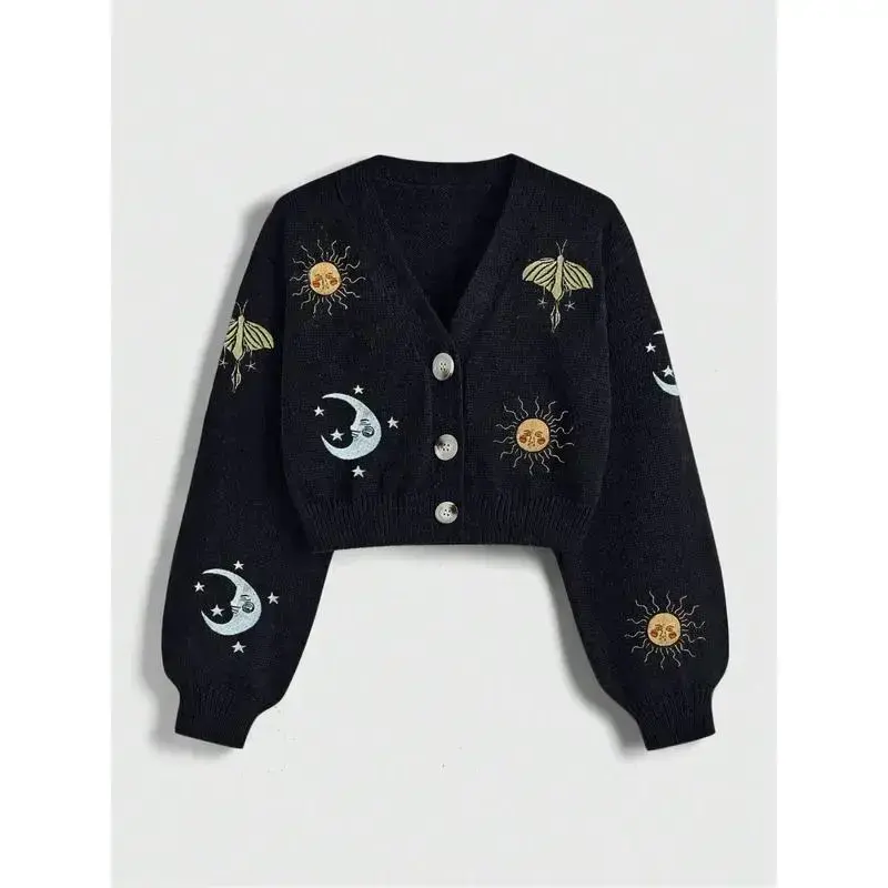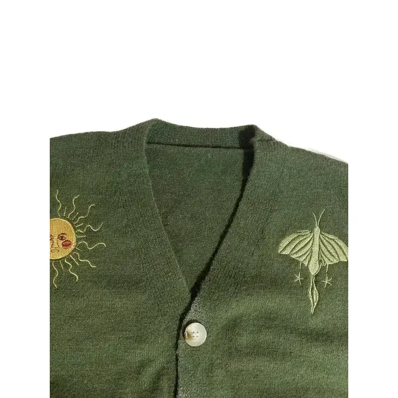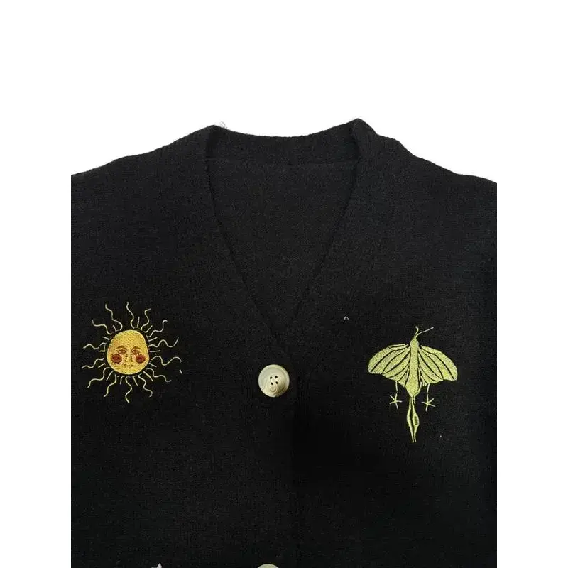 ??Unique Embroidery??: Featuring intricate sun, moon, and insect embroidery, this cardigan showcases an artistic touch that sets it apart from others. ??Layering Essential??: This button-up cardigan is an excellent layering piece for both indoor and outdoor occasions during fall and winter. ??Long Sleeve??: Designed with long sleeves for added warmth, it's suitable for various seasonal transitions like spring and fall. ??Fitted Cut??: The fitted cut provides a tailored look, ensuring a flattering silhouette while maintaining ease of movement. ??Practical Closure??: The convenient button closure facilitates easy wear, offering a functional approach while enhancing the overall appearance.