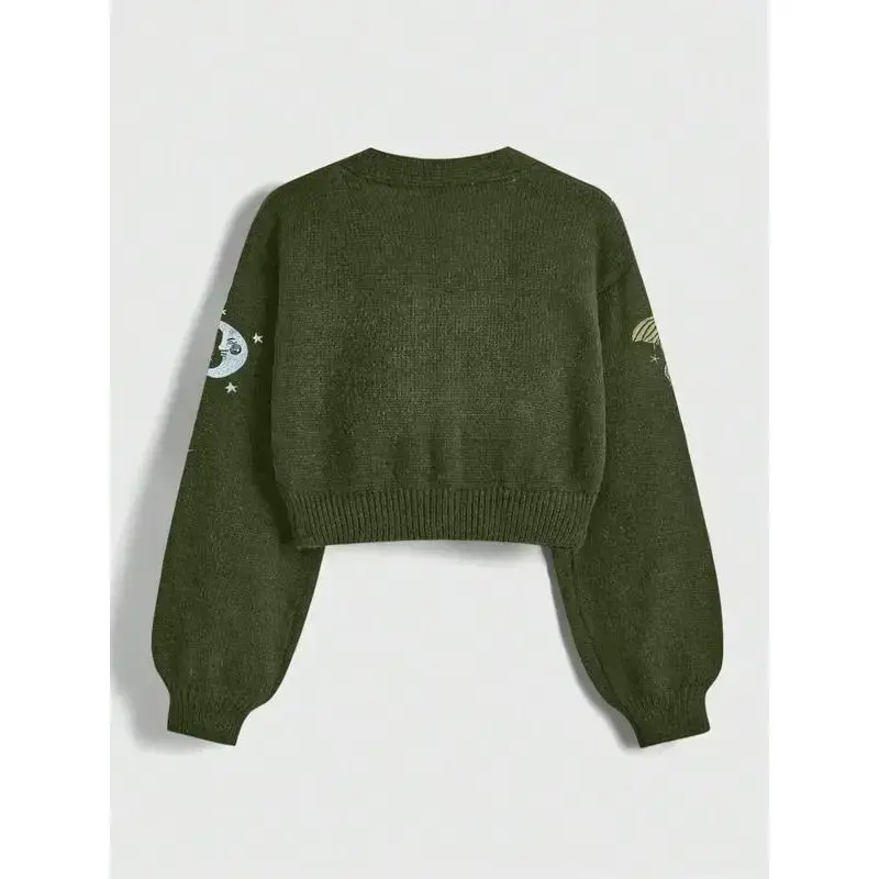 Women's Casual Elegant Knit Cardigan Sweater, Comfortable Warm Button Front Embroidered Sun Moon Insect Design, Perfect for Outerwear Commuting Knitwear