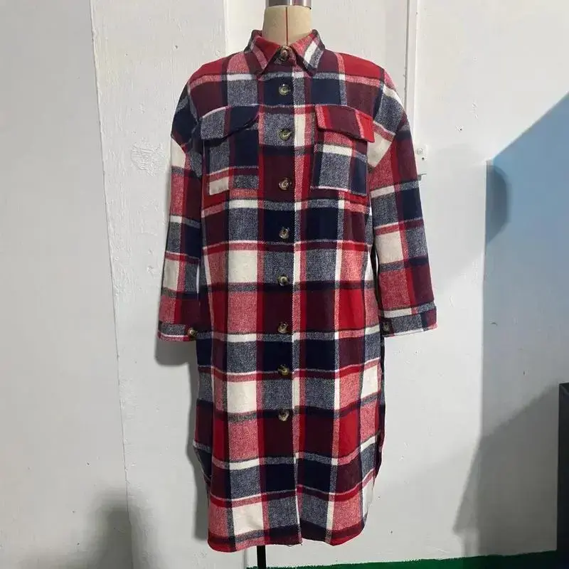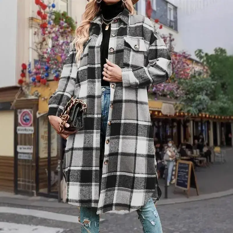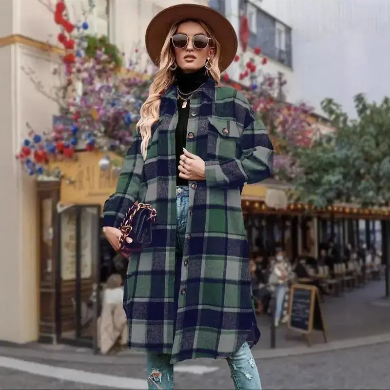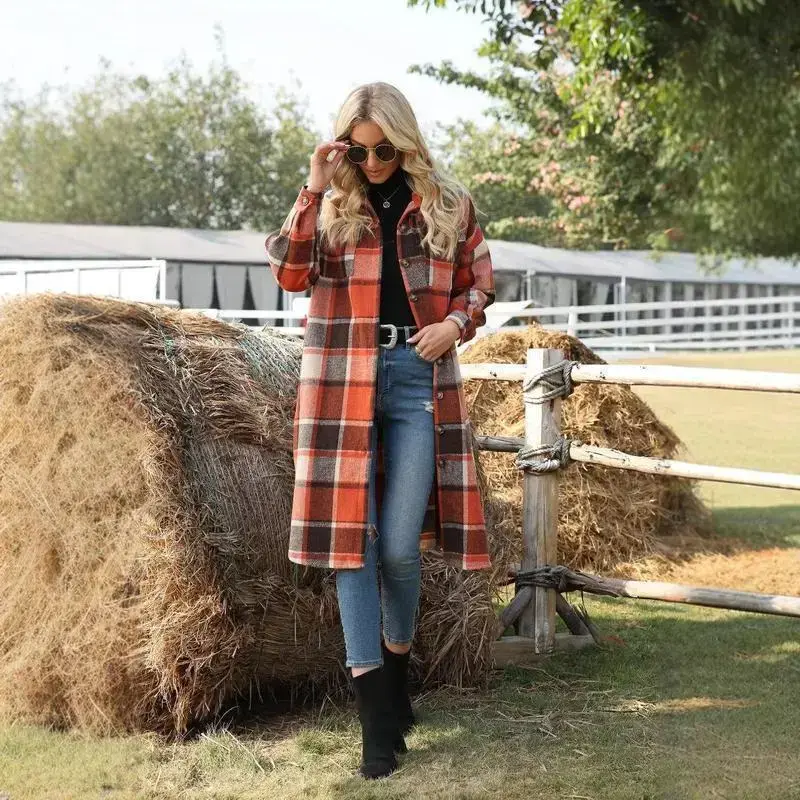 Women Fall Flannel Plaid Shacket Jacket Oversized Button Down Long Shirt Jacket Fit Cardigan
