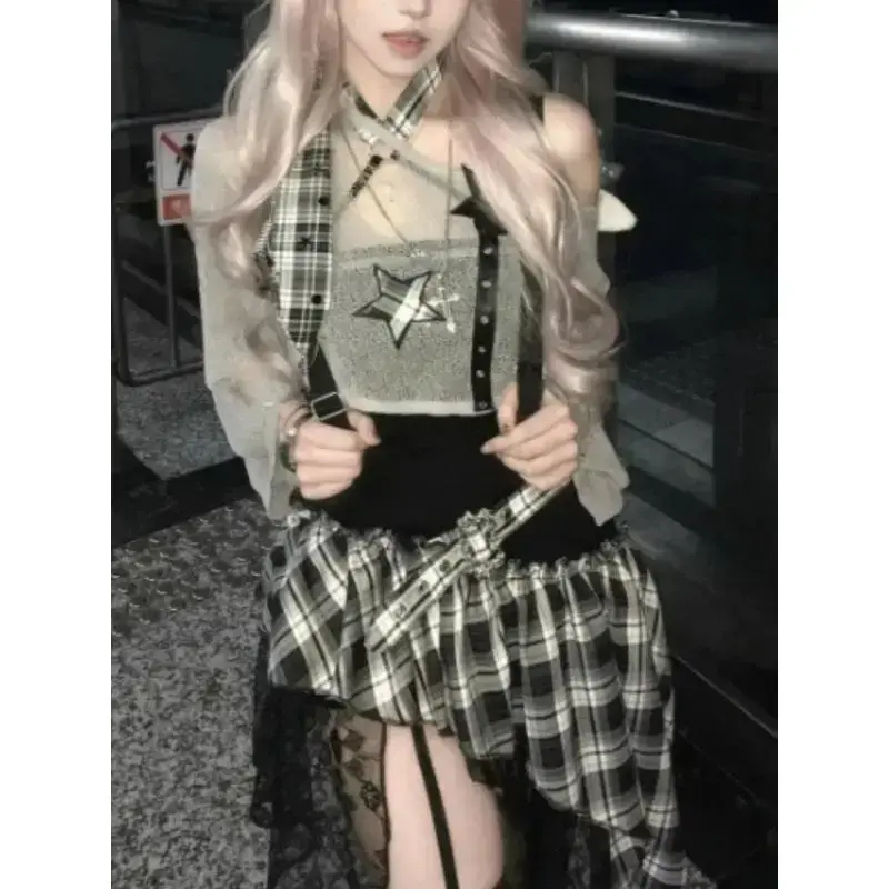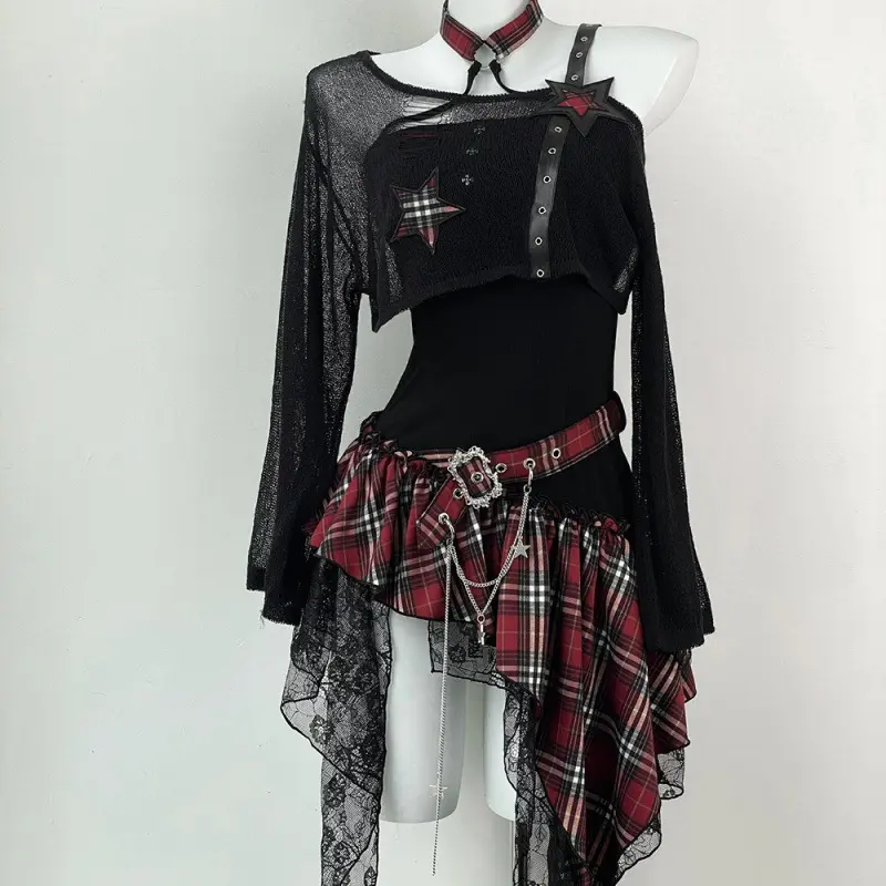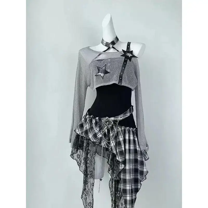 Gothic Hot Girl American Fashion 2 Piece Set Women Black Blouse + Chic Irregular Dress New Pure Desire Slim Vintage Suit Summer