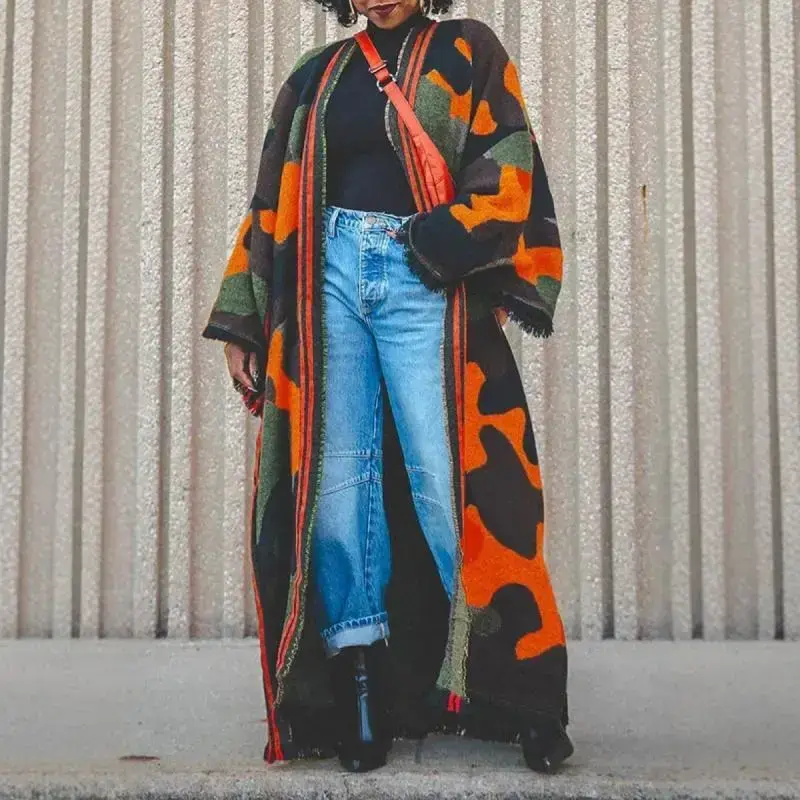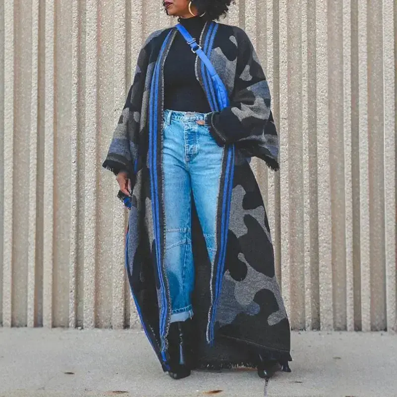 Autumn and winter women's large shawl scarf with military green camouflage and red stripes, thickened warm fabric, suitable for daily wear, commuting, and outdoor activities.