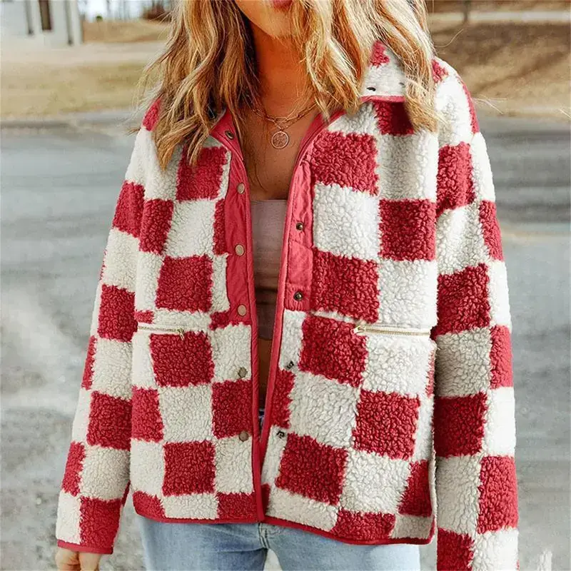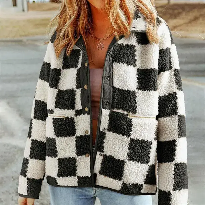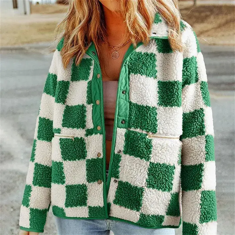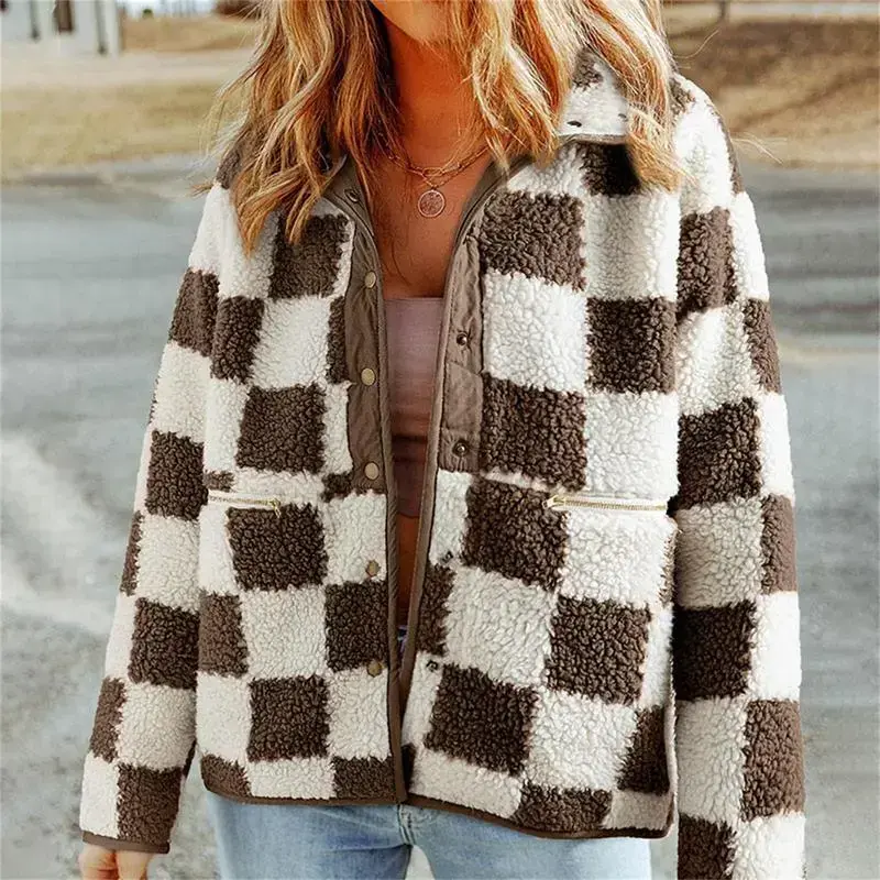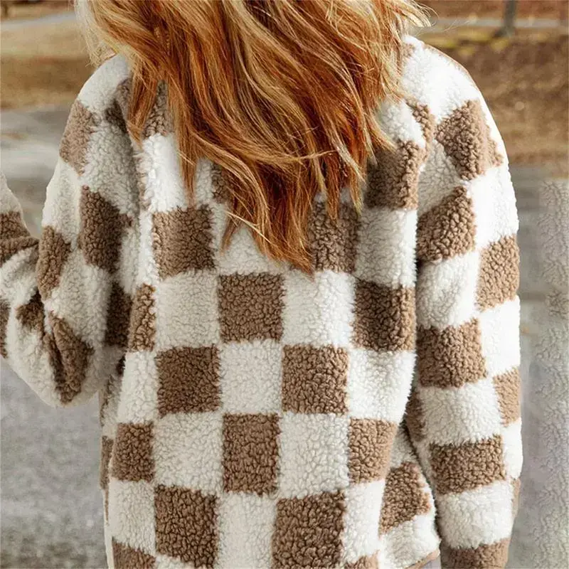 Women Fuzzy Plaid Coat Vintage Button-up Lapel Neck Long Sleeve Winter Warm Thicken Jacket Outerwear