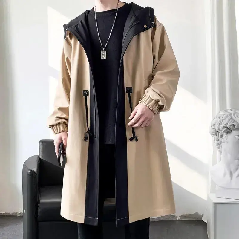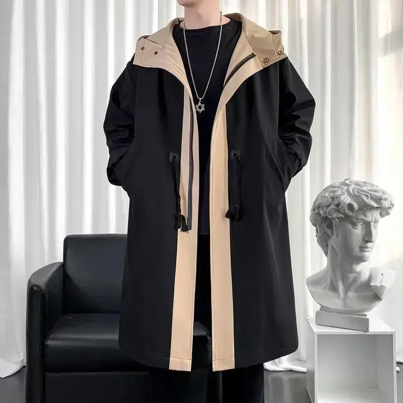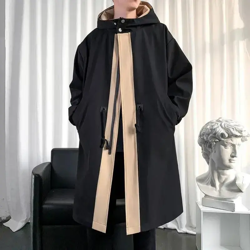 Men's Oversized Windbreaker Trench Coat, Contrast Patchwork Design with Zipper Waistband, Long Hooded Jacket