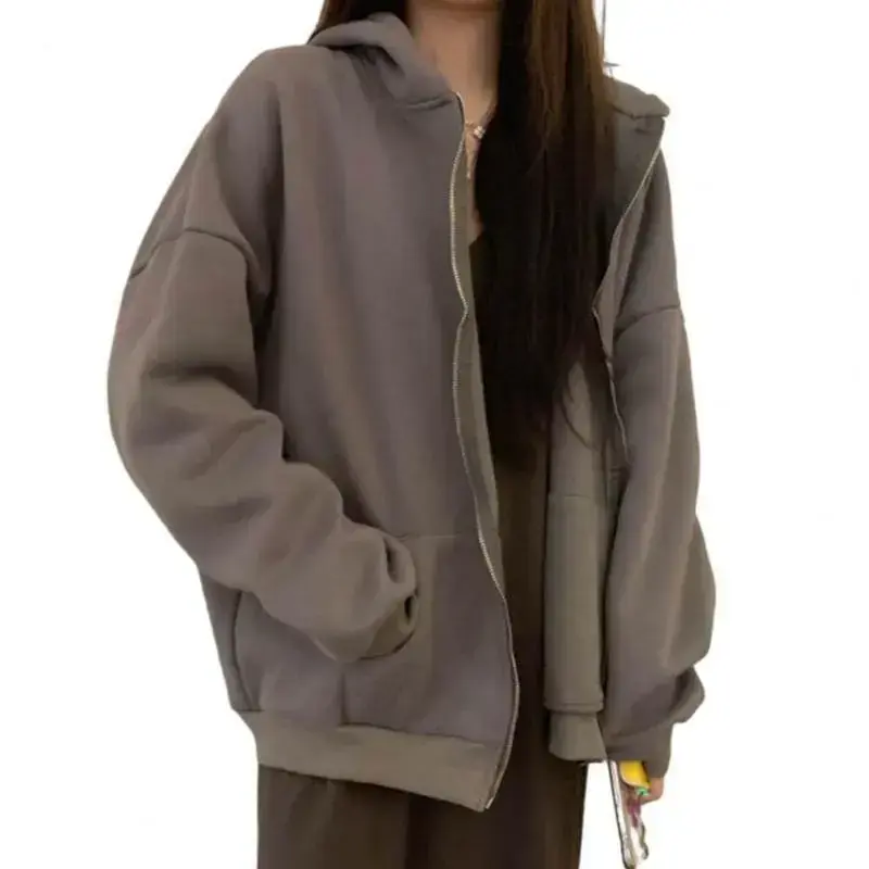 Women Hoodies Solid Color Zip Up Pocket Oversized Harajuku Korean Sweatshirts Female Long Sleeve Hooded Streetwear Casual Top