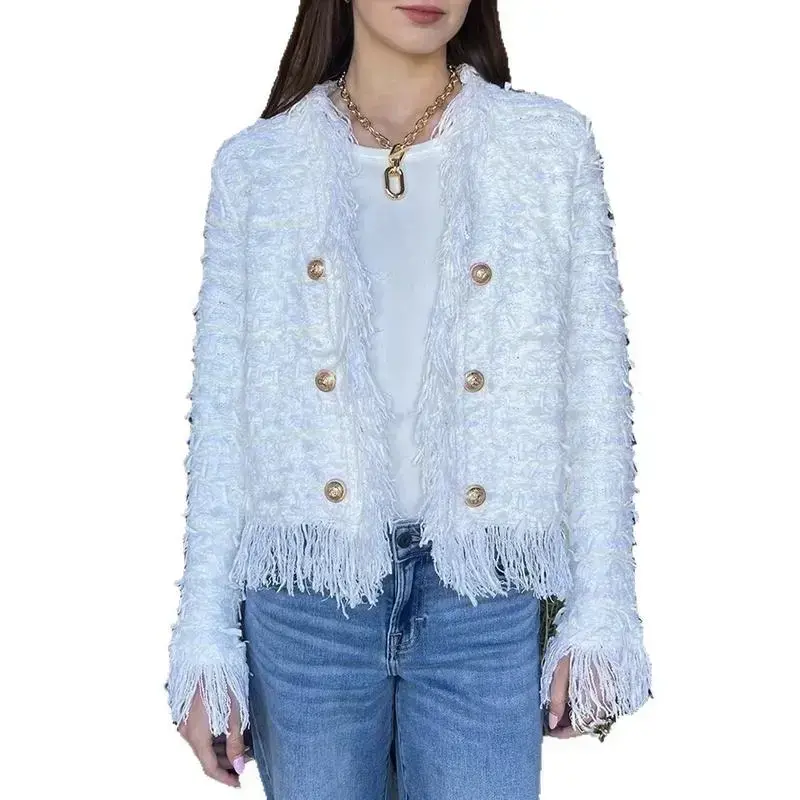 Tassel Little Fragrance Coat Jacket Women Elegant Temperament Double-breasted Coats Autumn Winter Solid Slim Clothing White