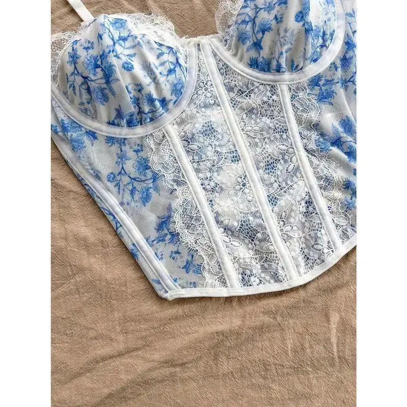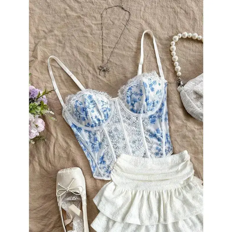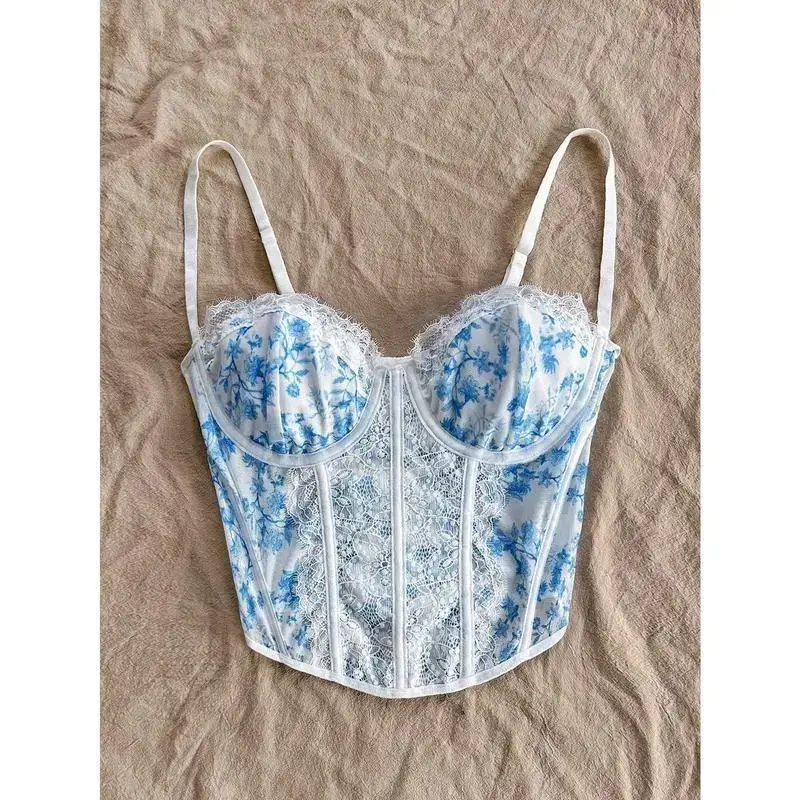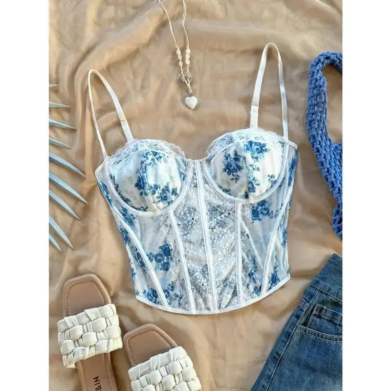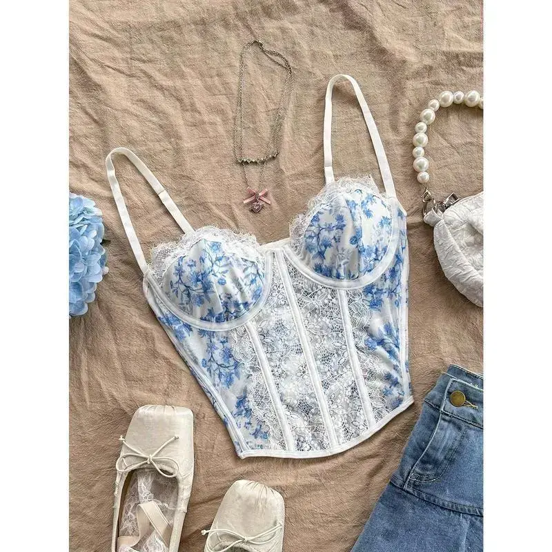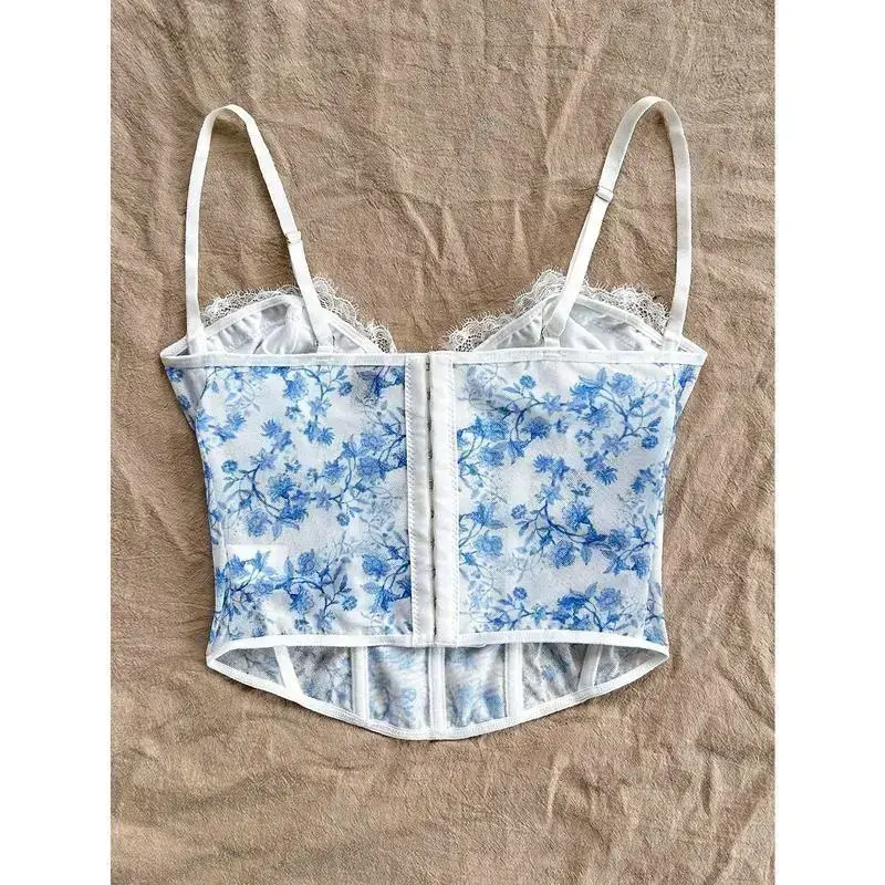 Women Vacation Blue & White Printed Lace-Trim Corset Front Bustier Cami Tank Top Spaghetti Womenswear Fit Soft