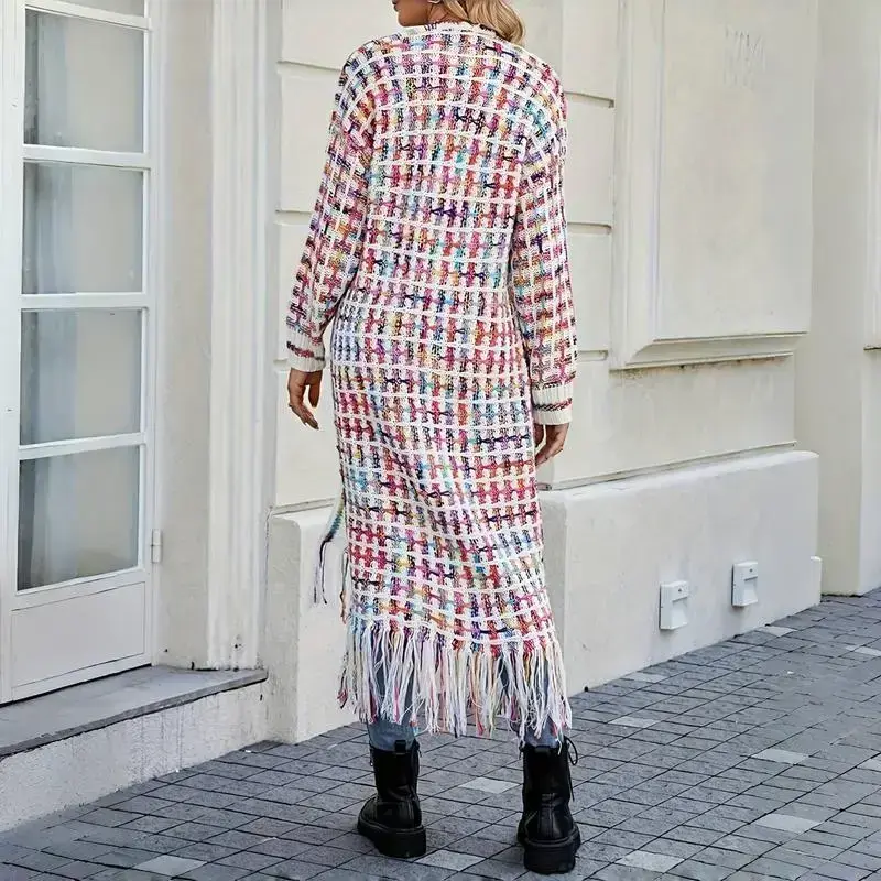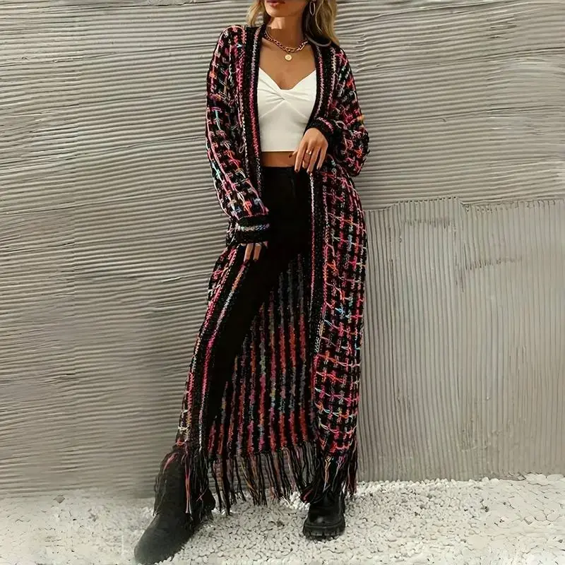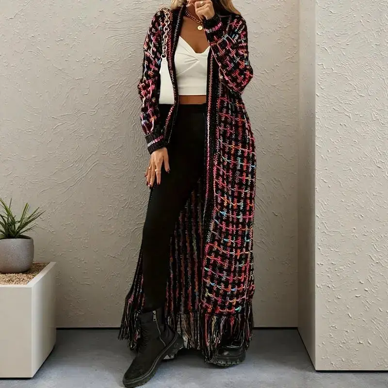 Women's Fall Winter Warmth Bohemian Casual Multi-Color Geometric Pattern Fringe Tassels Plaid Collar Hem Open Front Loose Fit Long Sleeve Cardigan Sweater Coat Outfit Knitwear(gift)