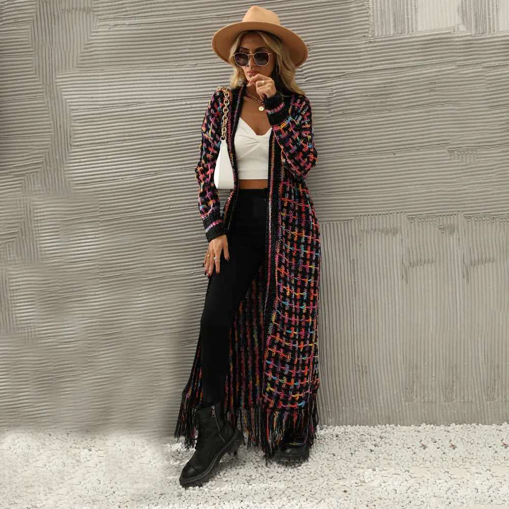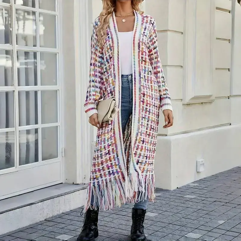 Women's Fall Winter Warmth ✨ Bohemian Casual Style ✨ This cardigan sweater coat is perfect for fall and winter. It features a bohemian casual design with a multi-color geometric pattern. The fringe tassels and plaid collar hem add a unique touch. The open front and loose fit ensure comfort. Long sleeves make it ideal for cooler days. This cardigan is a versatile knitwear piece. It can be worn as a sweater coat or a cardigan. The long sleeves and loose fit make it a great choice for casual outings. Perfect for layering in fall and winter.