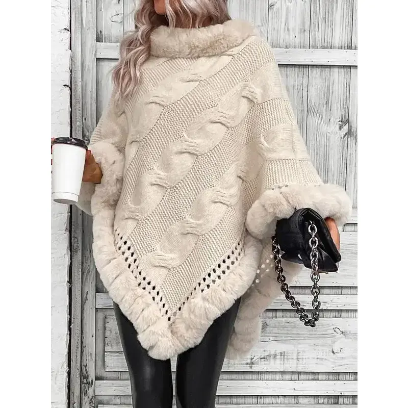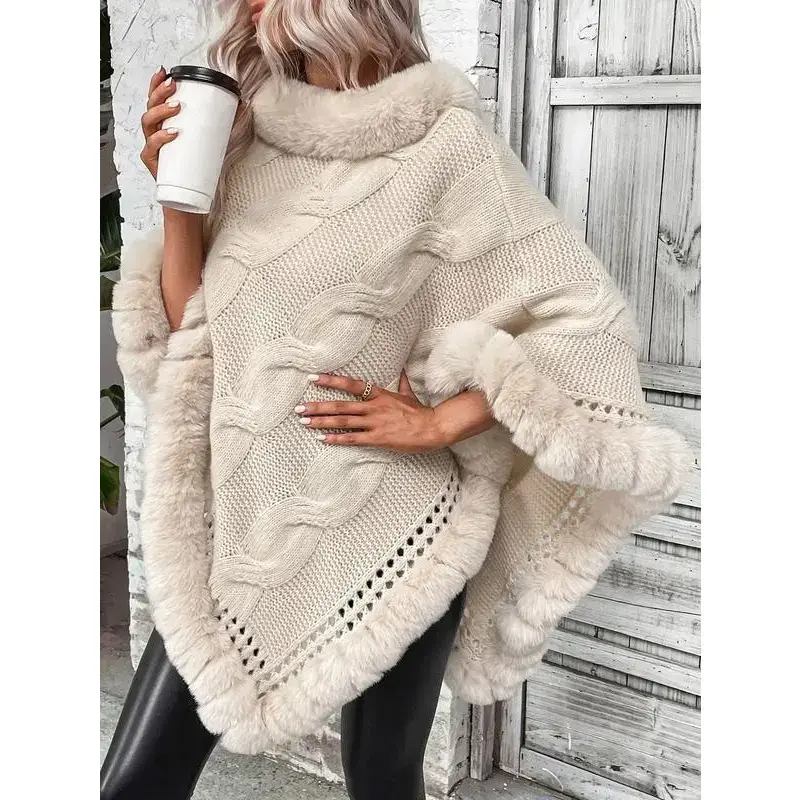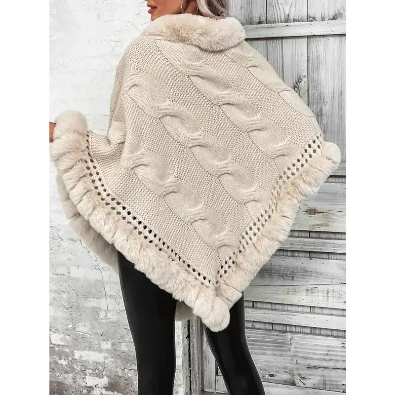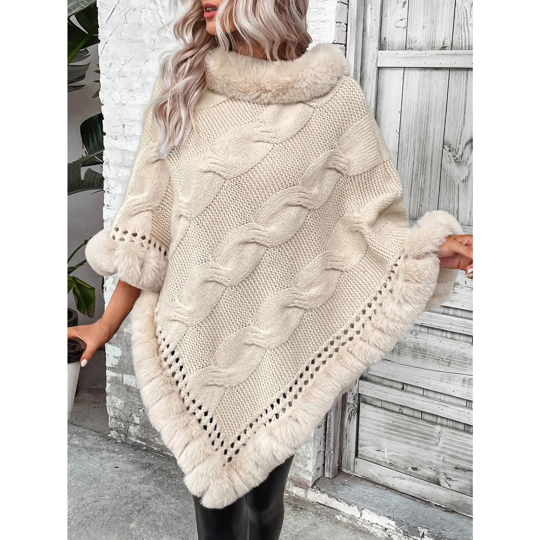 European and American Style Autumn Winter Knitted Sweater 20235 with Fur Collar and Cable Knit Cardigan Cape Sweater for Women