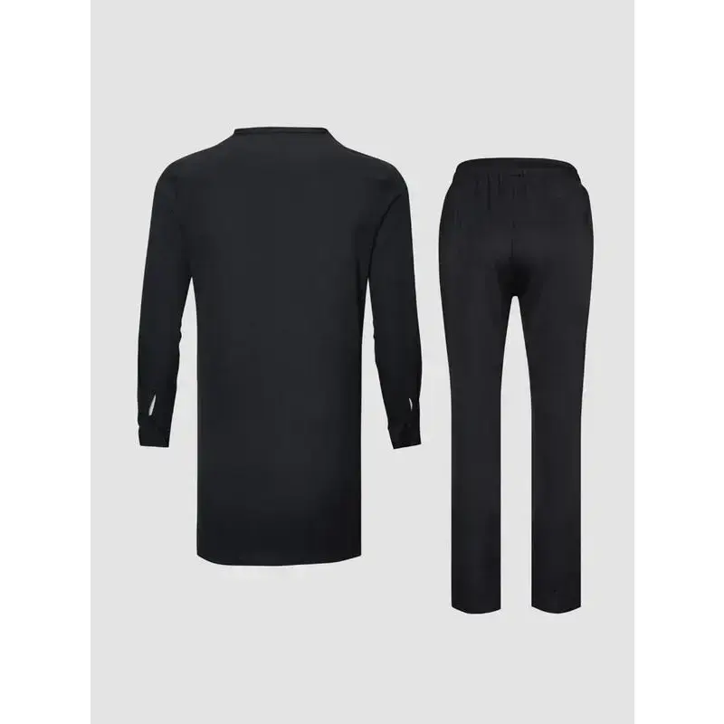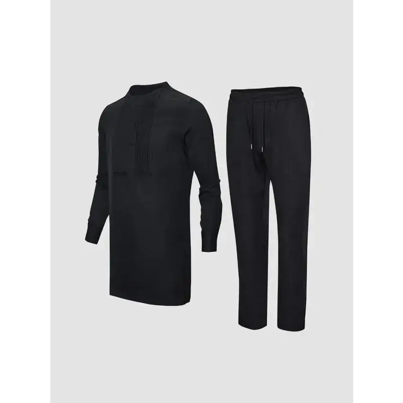 Plus Size Men's Black Pleated Dashiki Set, Long Sleeve, Elastic Waist Pants, African Style Casual Suit, Shirt & Trousers Set, Suitable For Party, Date, Everyday Wear
