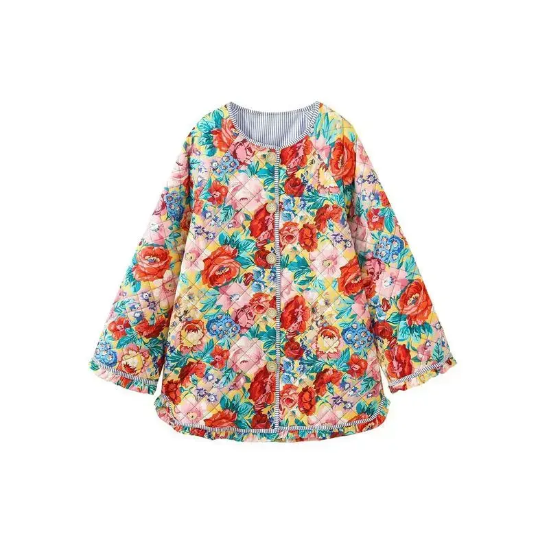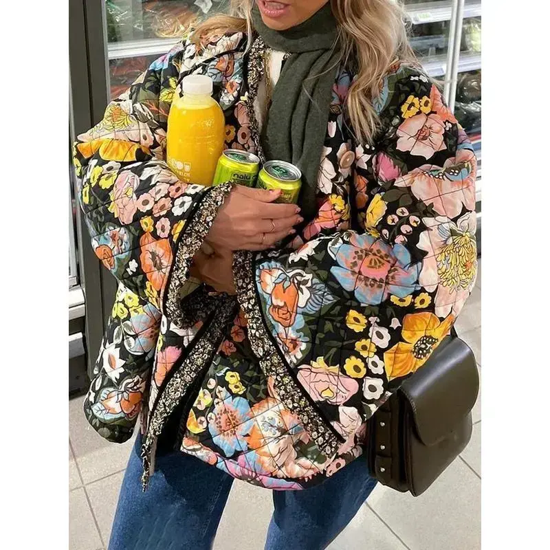 JacketsForWomen,WomenWinterLooseQuiltedJacketFloralPrintButtonDownLongSleevePaddedCoatWarmOutwear