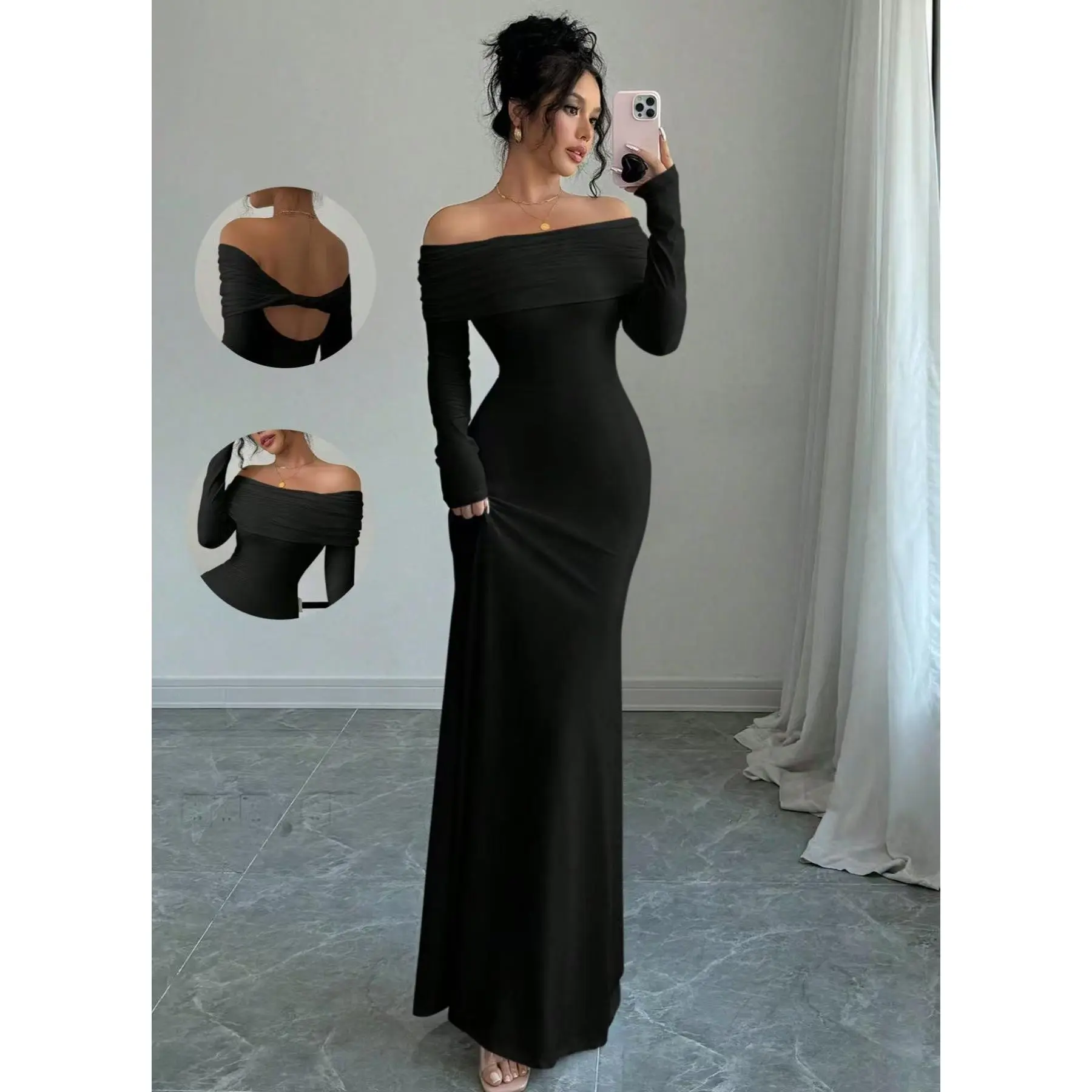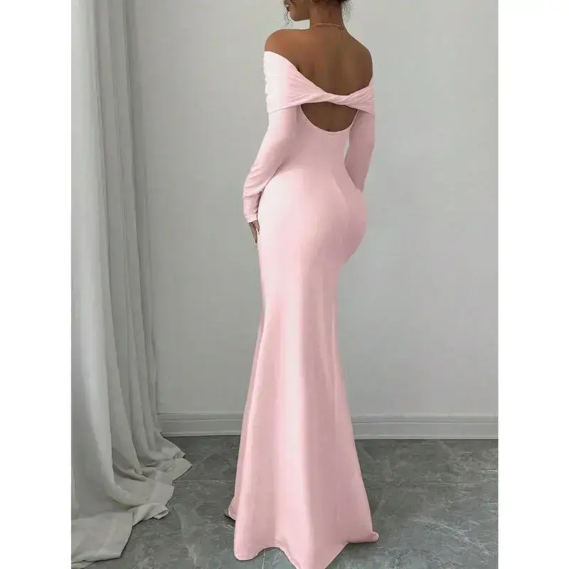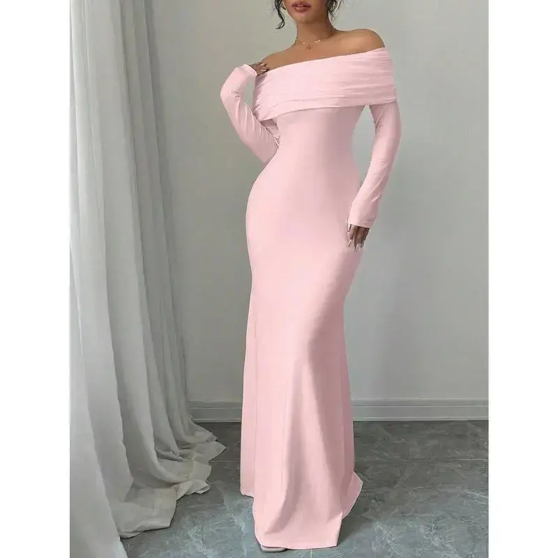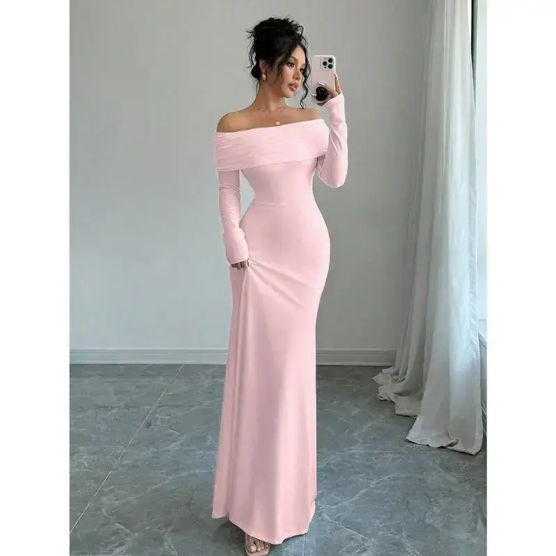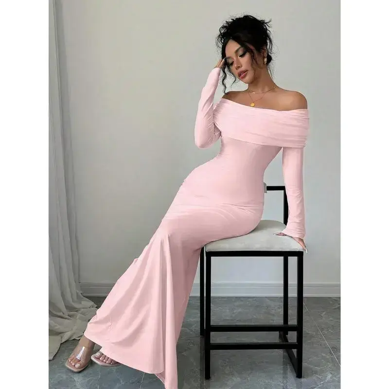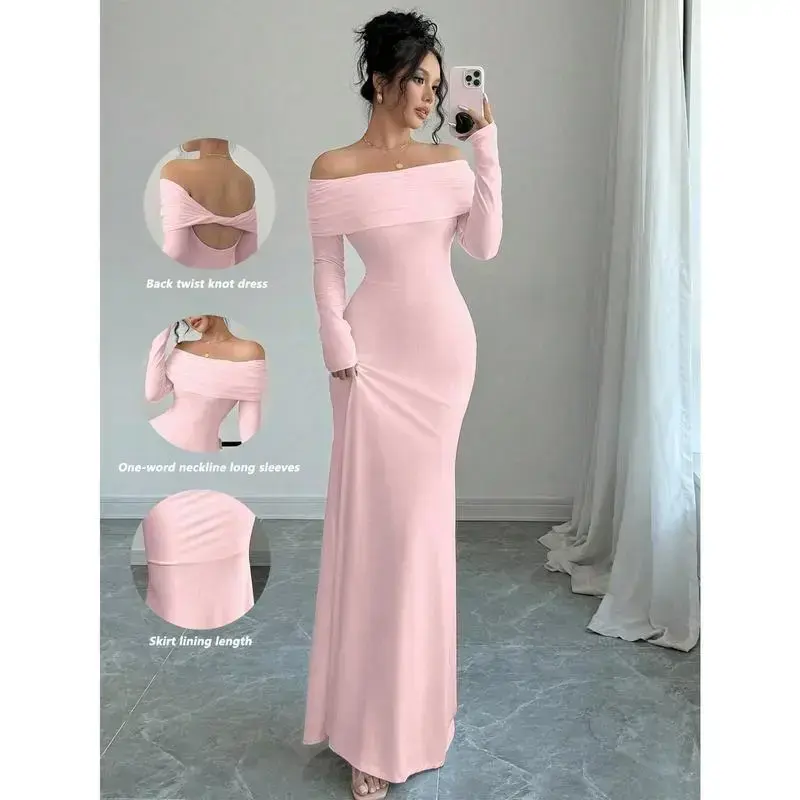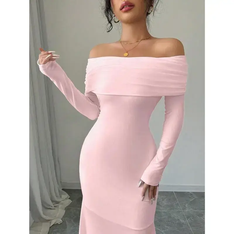 Type:Bodycon Style:Elegant Waist Line:Natural Lined For Added Warmth:No Neckline:Off the Shoulder Pattern Type:Plain Details:Ruched,Zipper Body:Yes Sleeve Type:Regular Sleeve Hem Shaped:Mermaid Color:Pink Sleeve length: wrist length sleeve Fit Type:Slim Fit Length:Long Material:Knitted Fabric Composition:95% Polyester,5% Elastane Care Instructions:Machine wash or professional dry clean Sheer:No Fabric:High Stretch