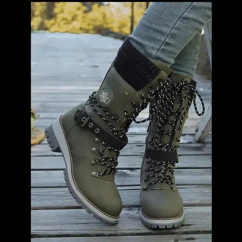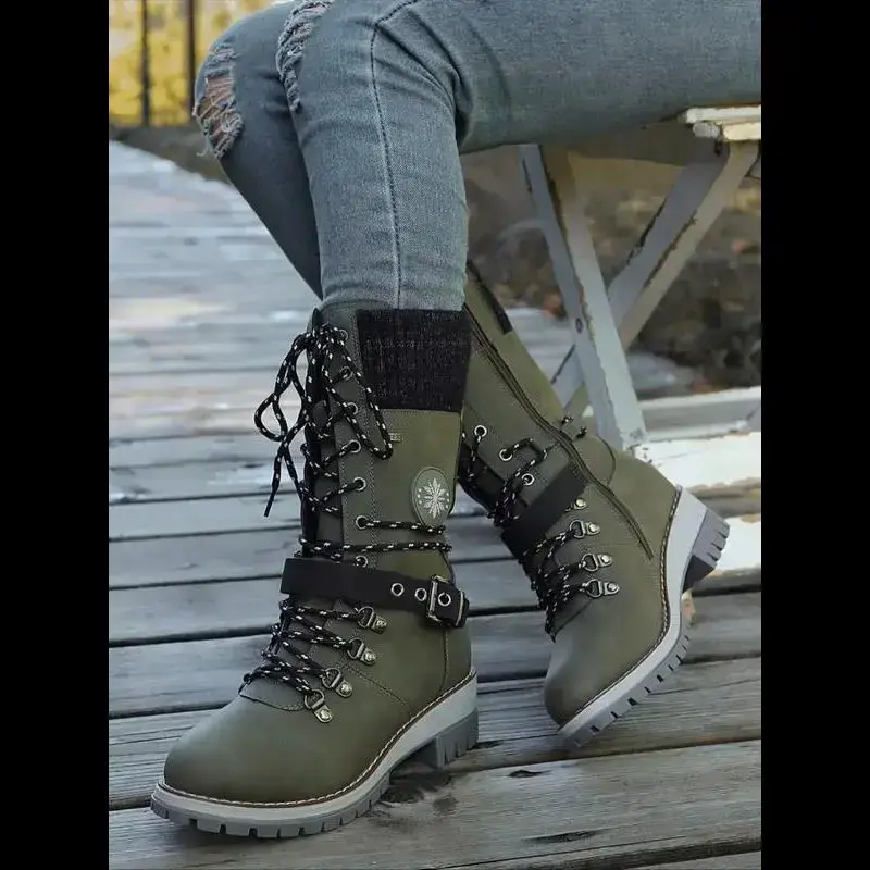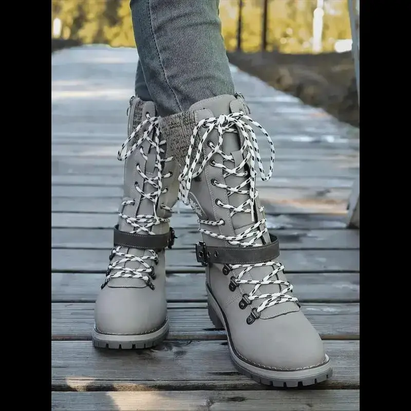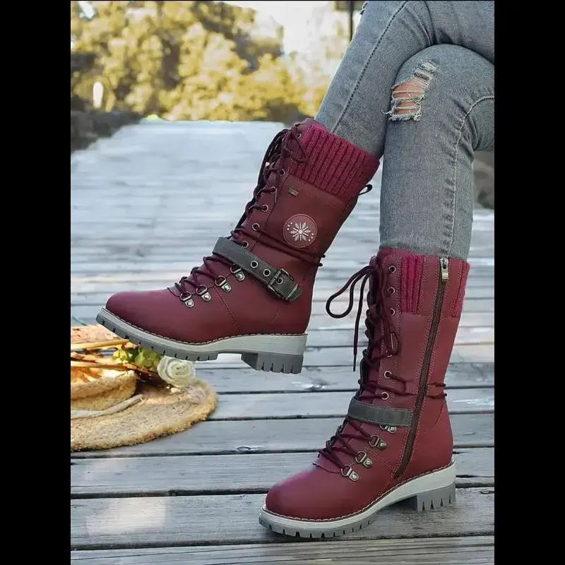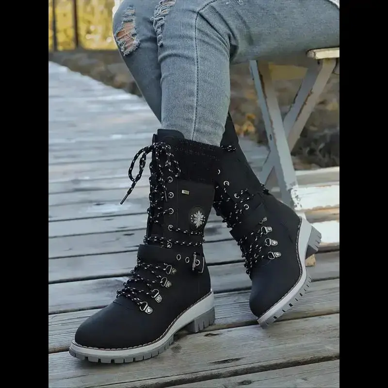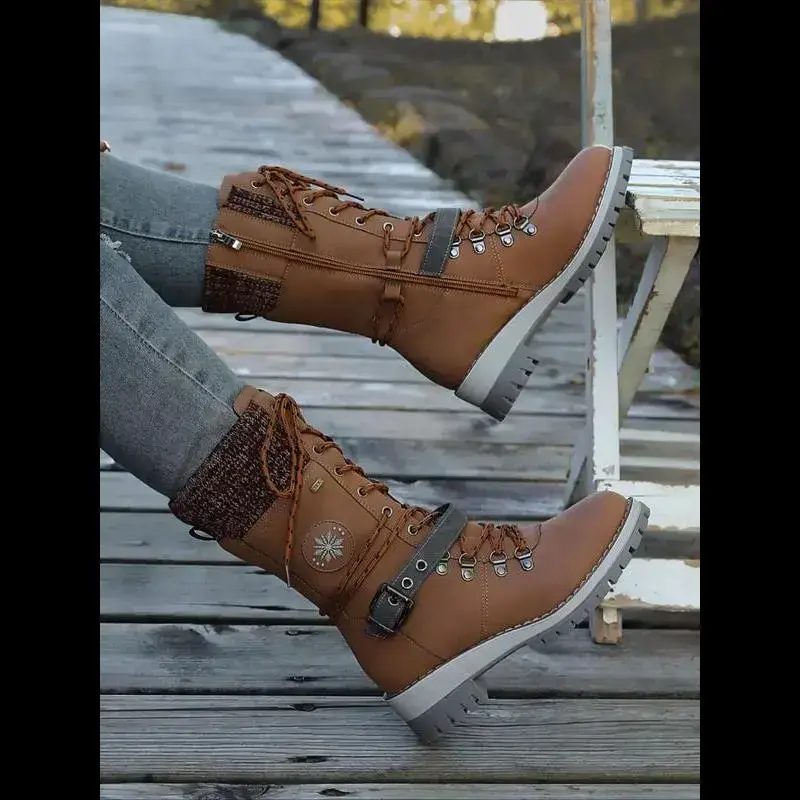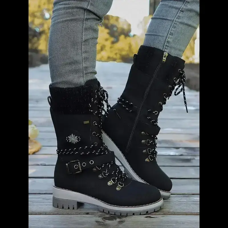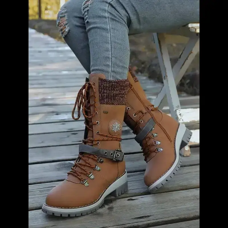 Large Size 35-43 New Style Men Women Front Lace-Up Knight Boots Winter Mid-Calf Round Toe Knit Patchwork Boots