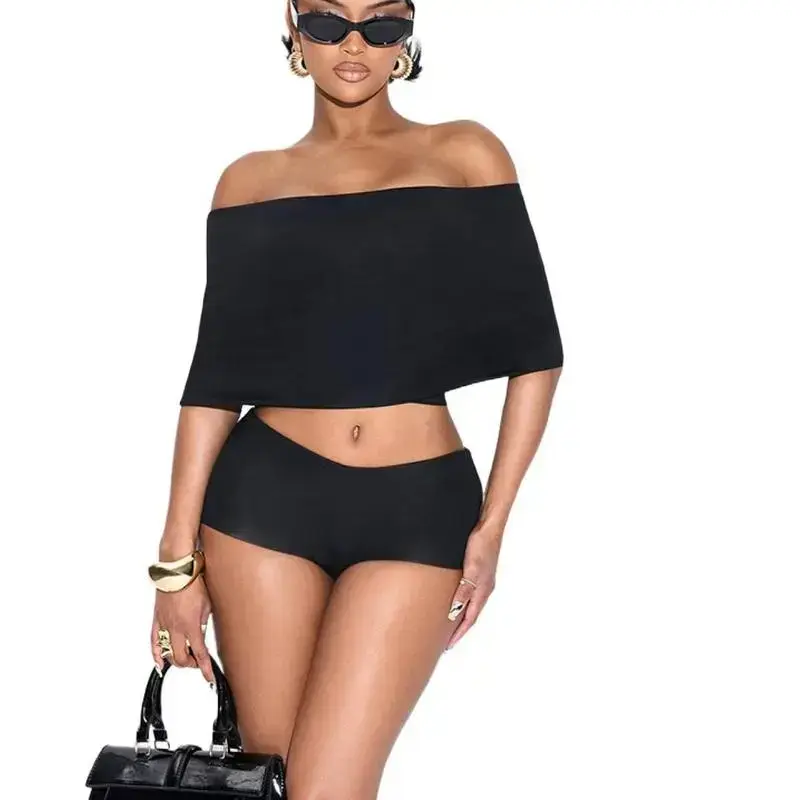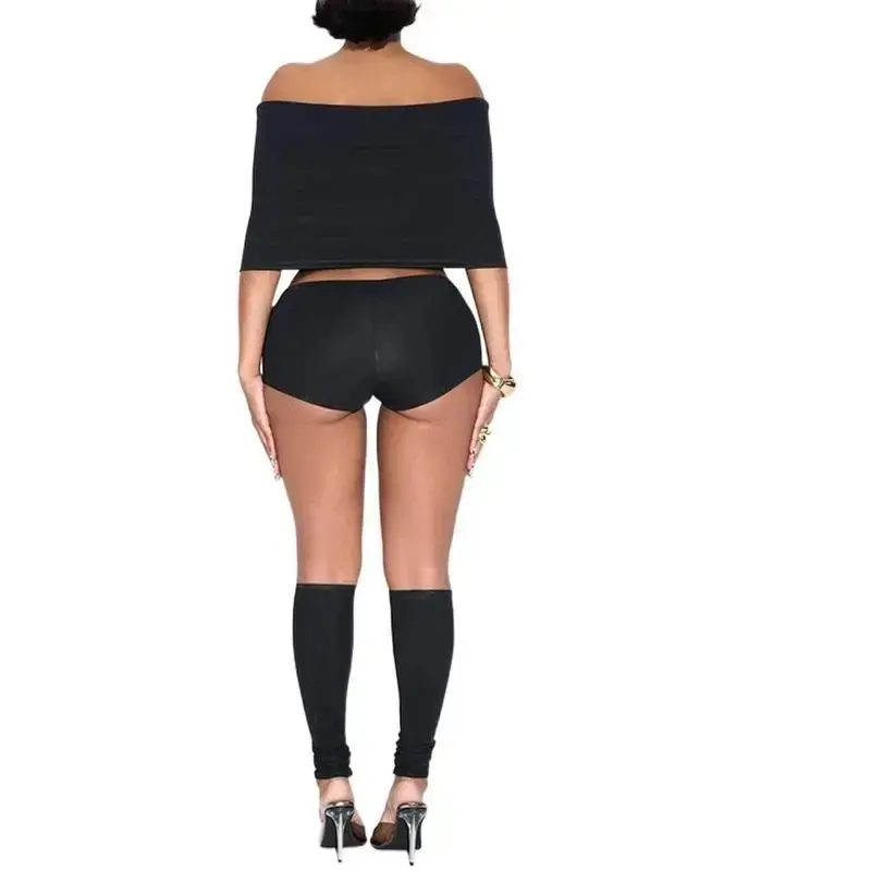 Chic Women's Black One-Shoulder Collared Top & Skinny Shorts Calf Socks Set for Party Outfits Street Trendsetter Minimalist Sleeveless Gamis Basic short skirt d Clothes Suits Womenswear