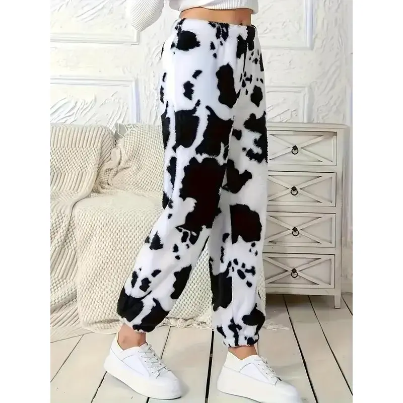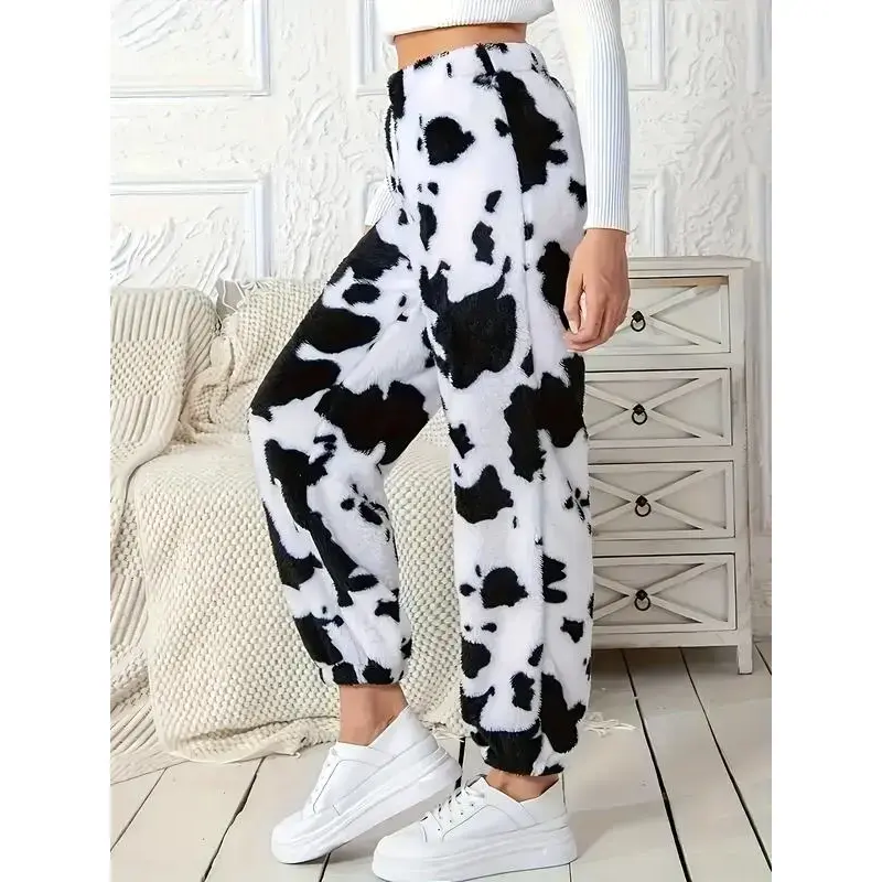 Women's Cow Print Plush Long Pants, Cute Cartoon Pattern, Warm Winter Wear, Casual Style, Comfortable Fabric, Perfect for Daily Use