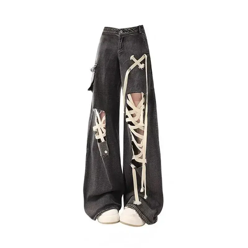 Black Gothic Y2k Ripped Cargo Jeans Japanese 2000s Style Baggy Bandage Denim Trousers Jean Pants Vintage Trashy Clothes