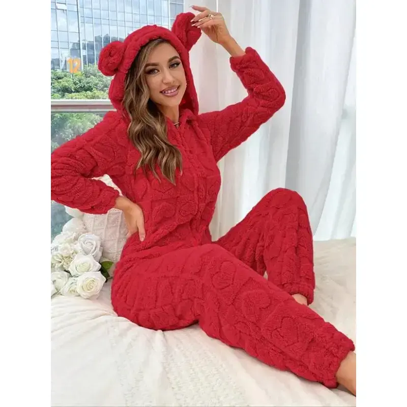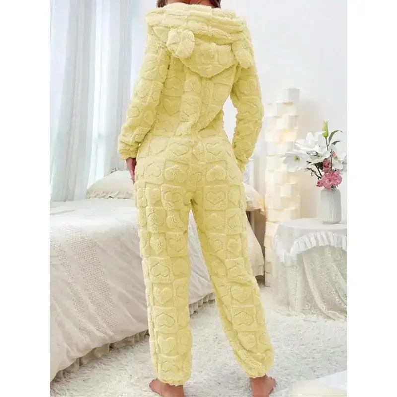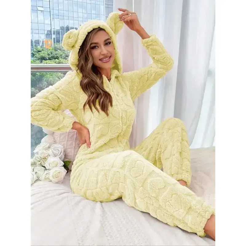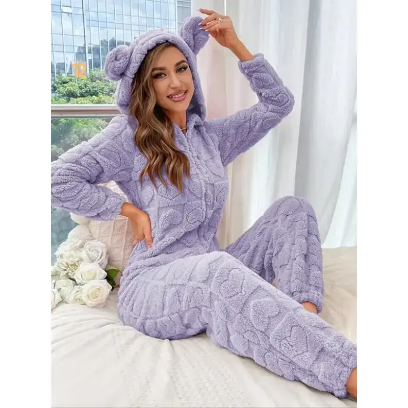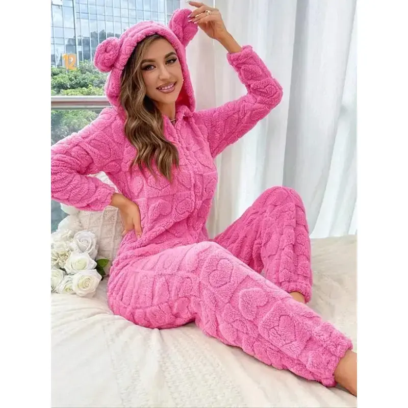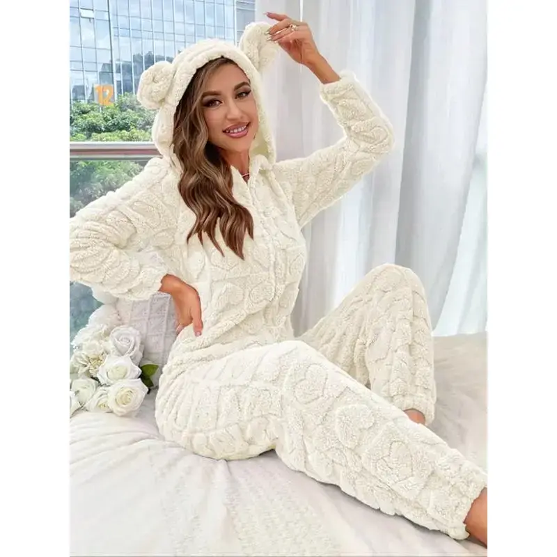 Women's Plush Onesie Pajamas Set, Long Sleeve Hooded Jumpsuit with Ears Design, Autumn Winter Warm Sleepwear for Ladies