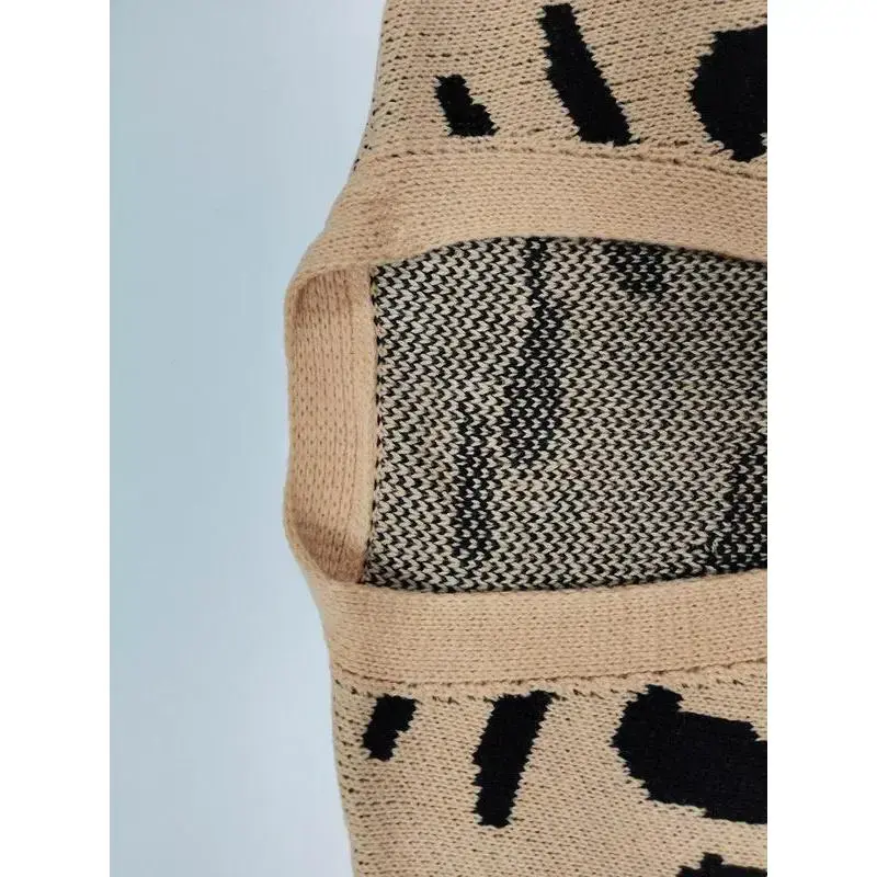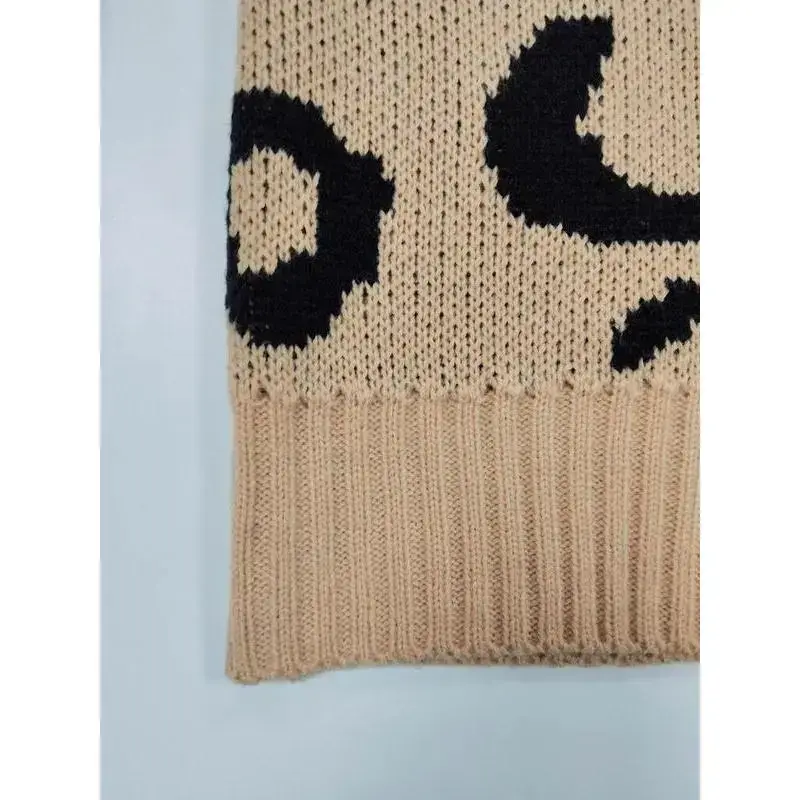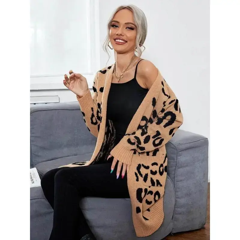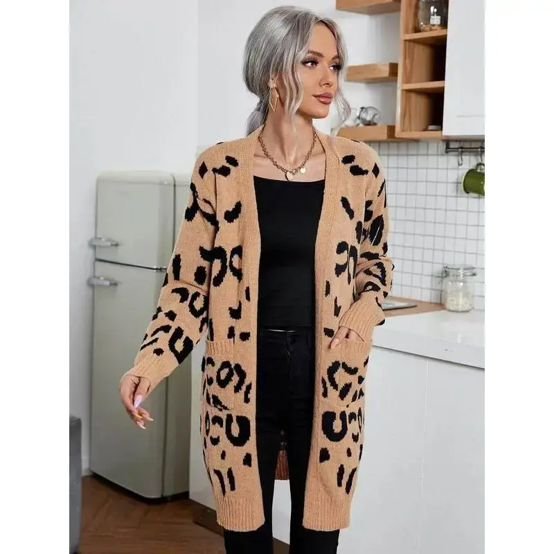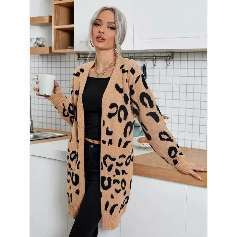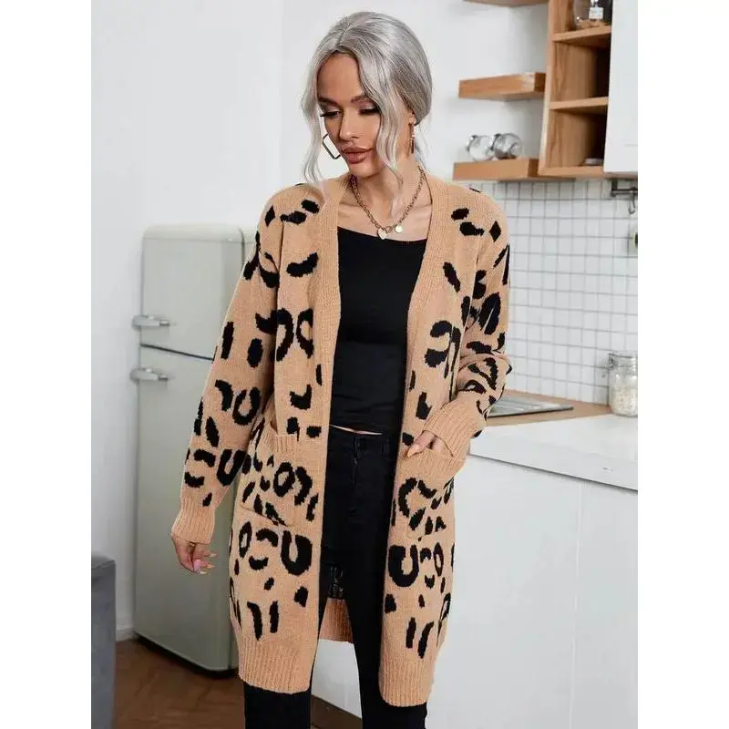 [Distinctive Pattern]: Features a unique leopard print that adds a bold touch to your fall and winter wardrobe. [Flattering Fit]: Designed to be fitted to emphasize your silhouette, creating a youthful and refined appearance. [Mid-Length Style]: The mid-length cut offers a balance between elegance and everyday practicality, suitable for various occasions. [Seasonal Fabric]: Crafted from moderate thickness knit fabric, providing warmth without sacrificing breathability for cooler seasons. [Long Sleeve Coverage]: Long sleeves offer added warmth and comfort, making this cardigan ideal for layering in colder weather.