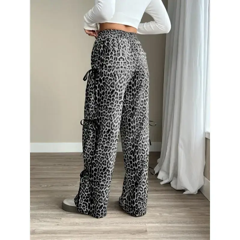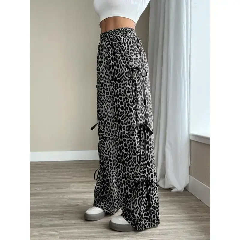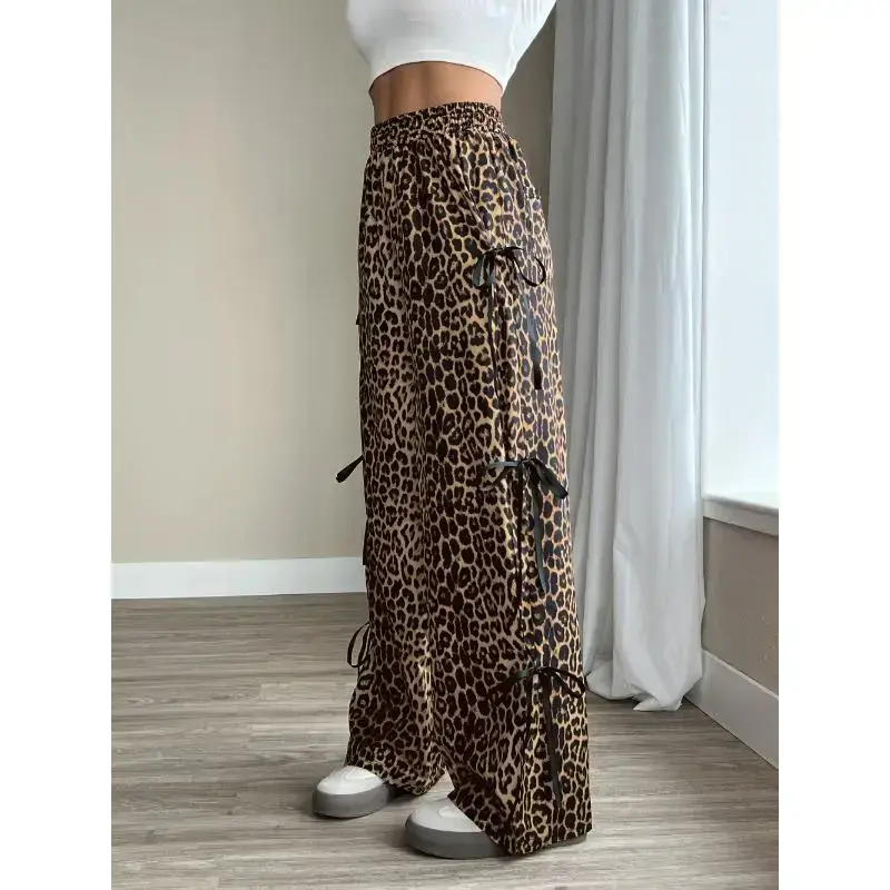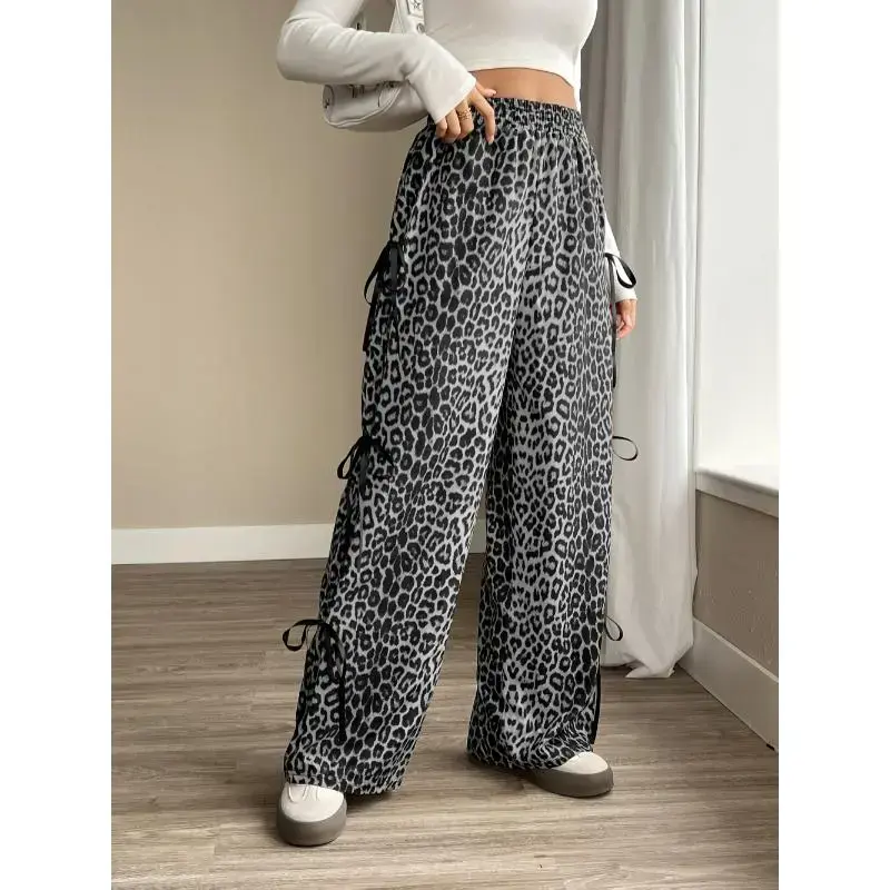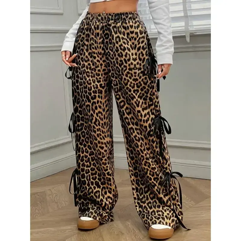 R8 Fashion Women's High-Waisted Pants Leopard Print Wide-Leg Casual with Side Bow Detail, Oversized Multicolor Trouser, Machine Washable