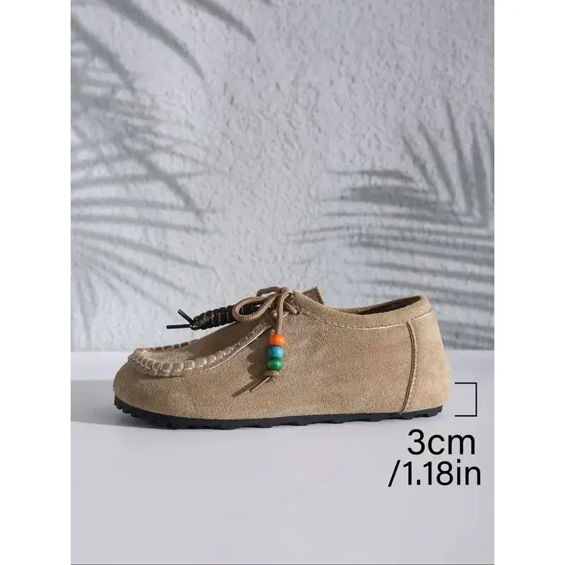 【Arch Support】: Featuring an integrated arch support, these shoes provide enhanced stability and reduce foot fatigue during long walks. 【Unique Material】: Constructed with a soft cork insole topped with a cloth upper, providing a blend of cushioning and breathability. 【Round Toe Shape】: Designed with a round toe shape that allows for natural toe splay, promoting comfort and better balance. 【Lightweight Build】: The lightweight construction makes these loafers easy to wear, ensuring less strain on the feet throughout the day. 【All-Season Use】: These shoes are suitable for all seasons, adaptable to varying weather conditions without losing functionality. 【Bohemian Chic Design】 – Stylish suede loafers with colorful beaded tassels, perfect for adding a vintage boho touch to any outfit. 【Soft & Supportive Fit】 – Featuring a cushioned footbed with arch support for all-day walking comfort. 【Easy Slip-On Style】 – Convenient lace-up slip-on design makes these flats perfect for daily wear, commuting, and travel. 【Versatile Occasions】 – Ideal for casual outings, shopping, cottagecore picnics, or relaxed office days. Durable Anti-Slip Sole – Lightweight rubber outsole ensures stability and confident steps on any surface.