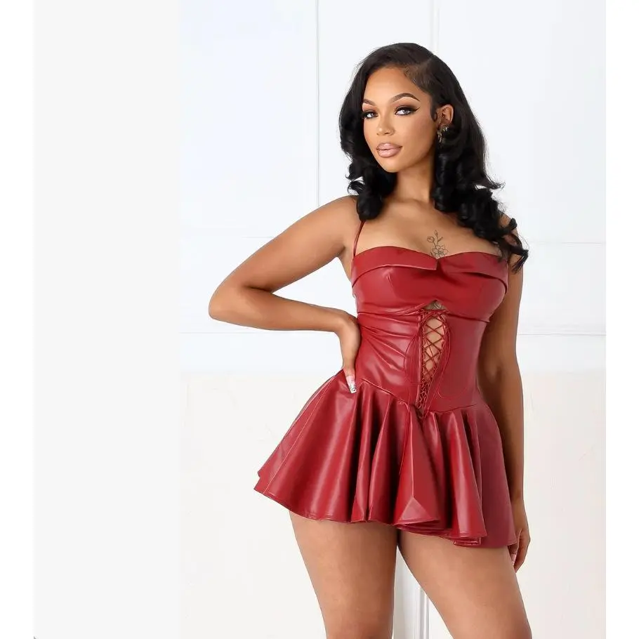2025 women's short skirt solid color sleeveless lace up sexy tube top pu leather party dress Formal Womenswear Fashion