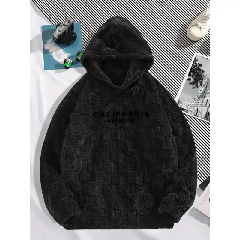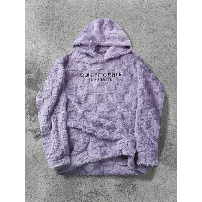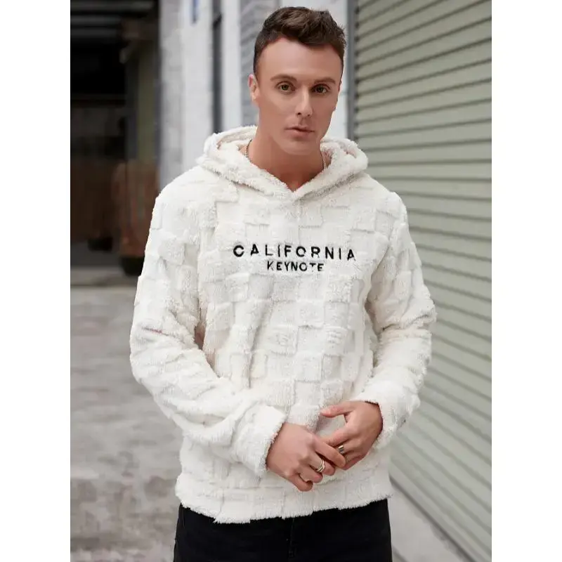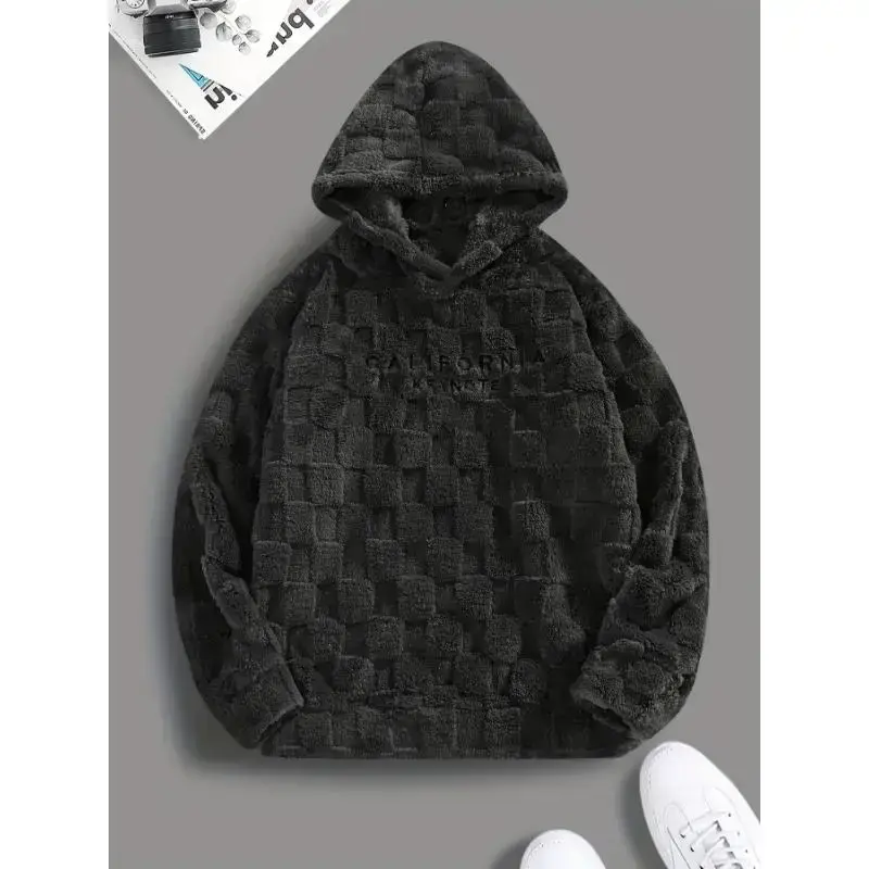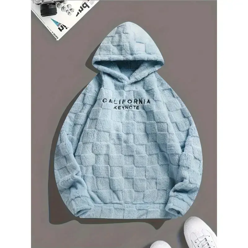 Trendy Fleece Hoodie with "CALIFORNIA KEYNOTE" Letter Embroidery, Chic Design Men's Plaid Pattern and Textured Hooded Sweatshirt for Daily Outerwear
