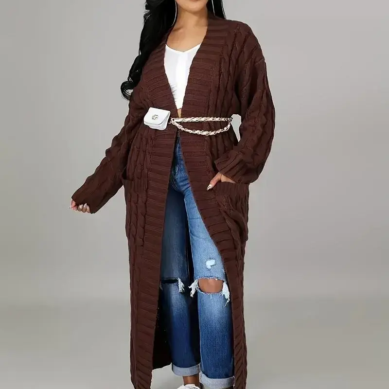 Fashion Women's Clothing Long Length Cable Knit Cardigan - Elegant Solid Long Sleeve Sweater With Pockets - Women's Clothing - Fall/Winter - Suitable Casual Formal Occasions - Women