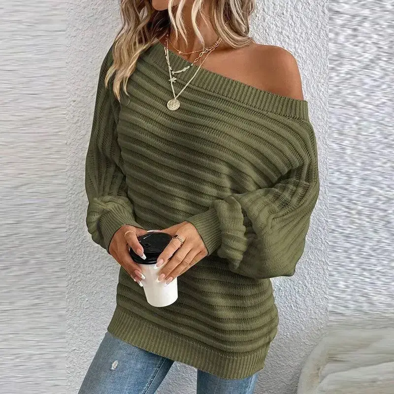 Fashionable Elegant Knitted Top Off Shoulder Batwing Sleeves Solid Color Pullover Women Autumn Loose Casual Retro Sweater Outfit