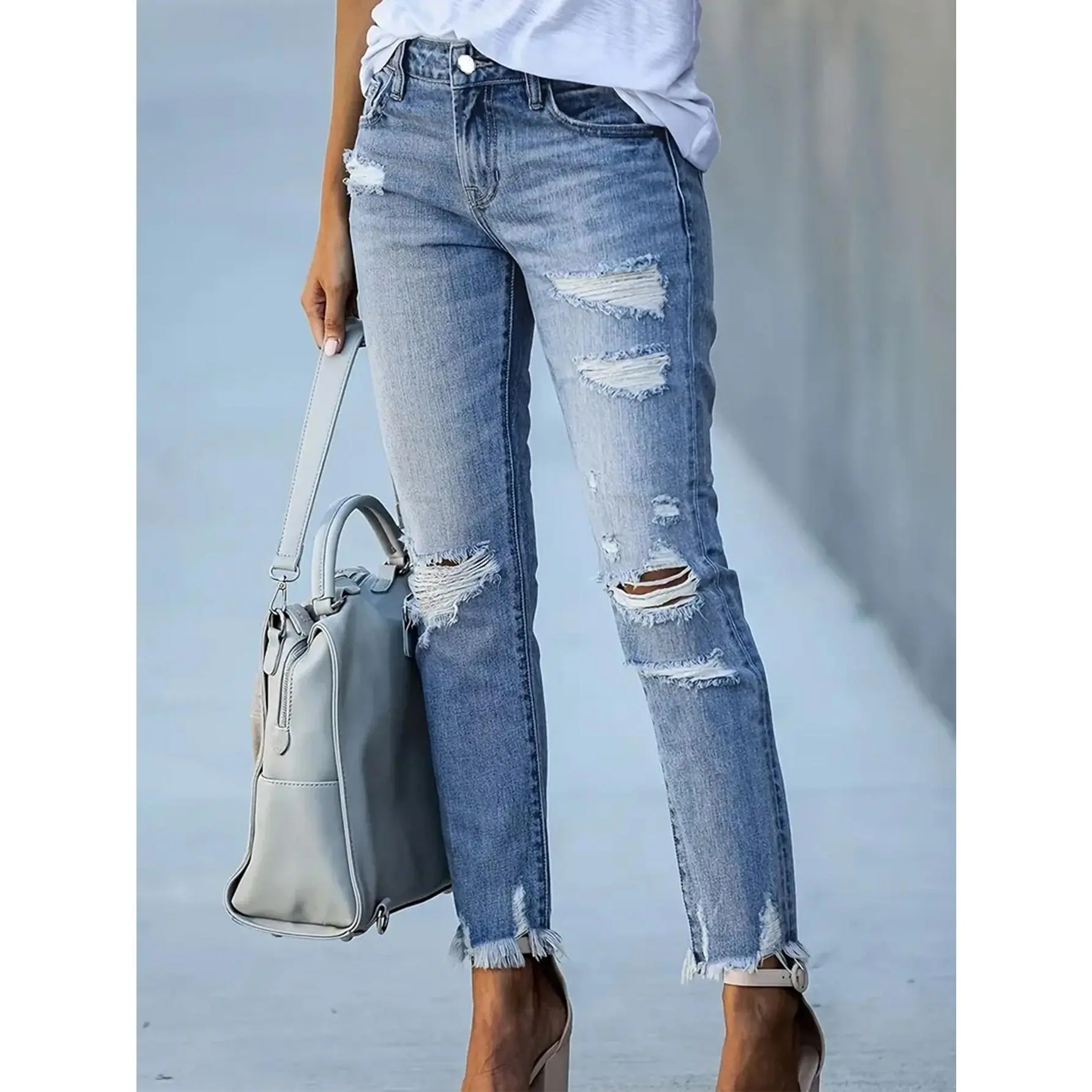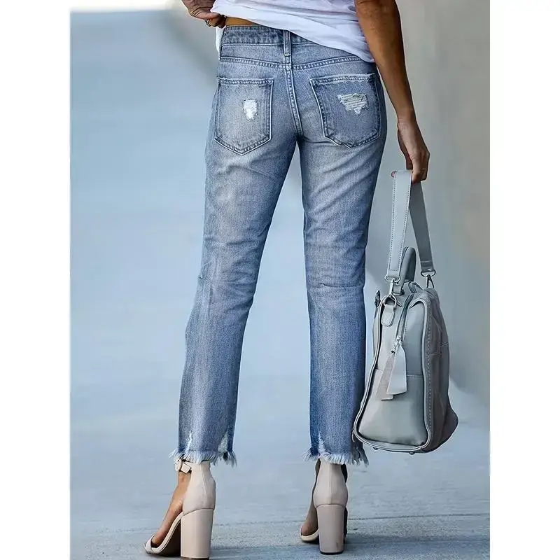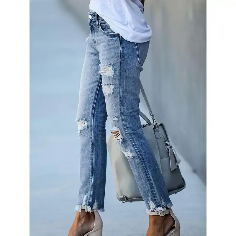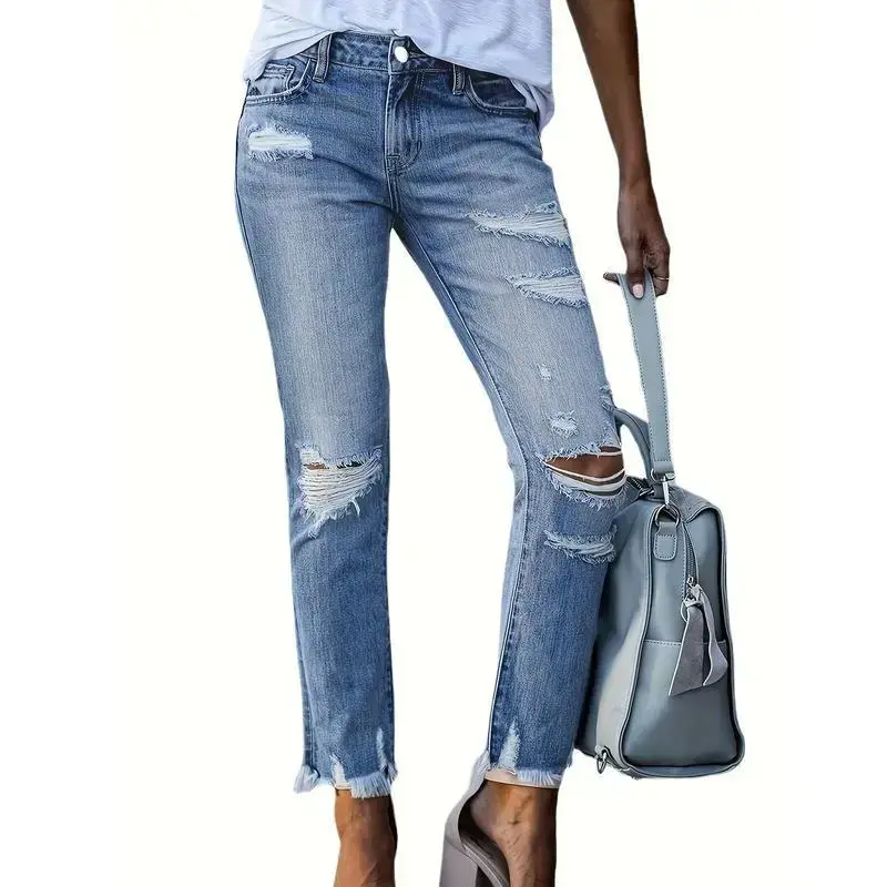 Women's Stretchy Ripped Skinny Jeans ✨ Elevate your style with these mid-rise, distressed denim jeans! Crafted from a blend of 70% cotton, 23% polyester, 5% viscose, and 2% spandex, these jeans offer high stretch for comfort. The cropped length and ripped details add a trendy touch. Perfect for all-season wear, these skinny jeans are machine washable but not suitable for dry cleaning. 🌟