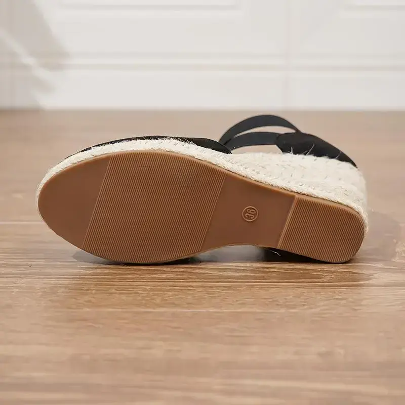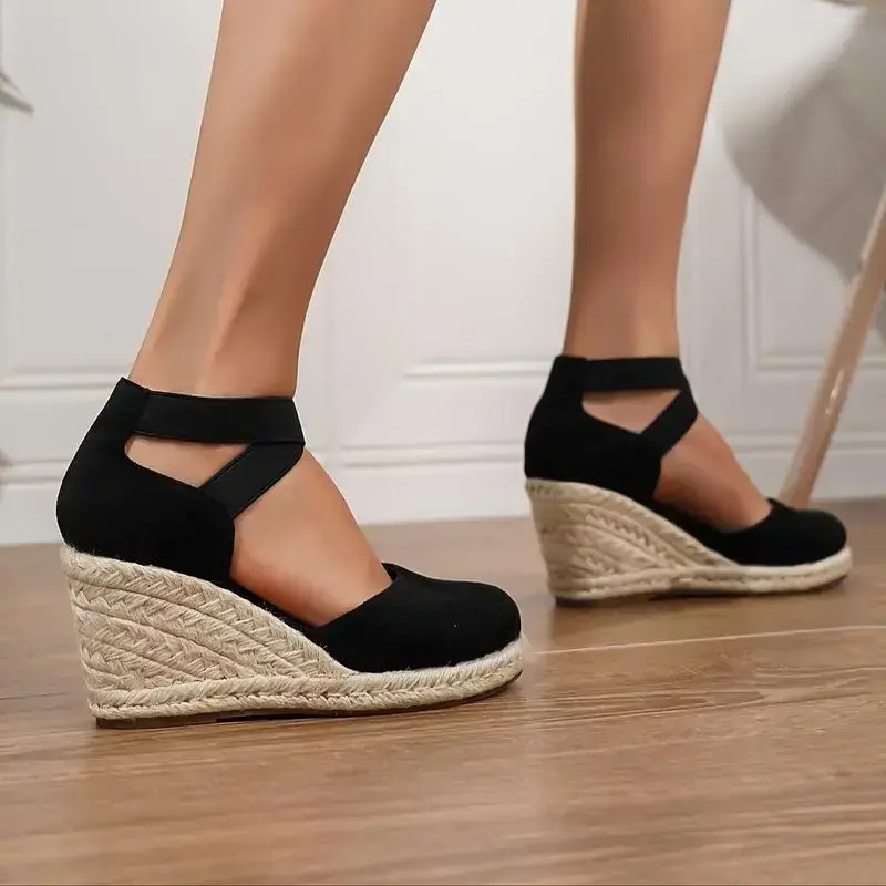 Spot goods Women's Solid Color Trendy Sandal - Elastic Band Platform Closed Toe Espadrilles Shoes, Hollow Out Wedge Comfy Shoes - For Women - Suitable for Summer, Casual Wear - Gift for Fashionable Women