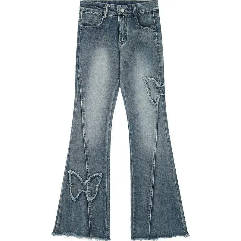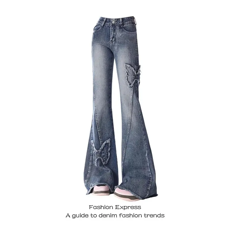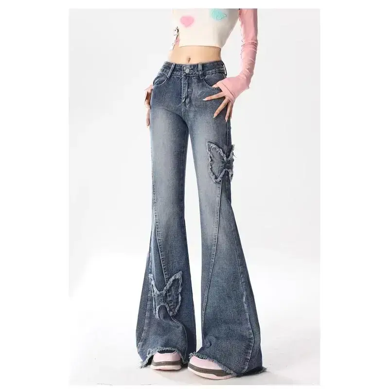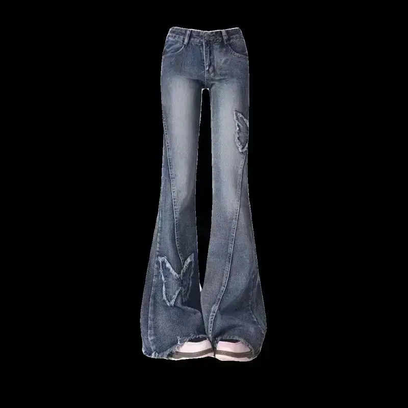 American Retro Butterfly Embroidery Flared Jeans for Women High Waist Floor-Length Can be used with raincoat