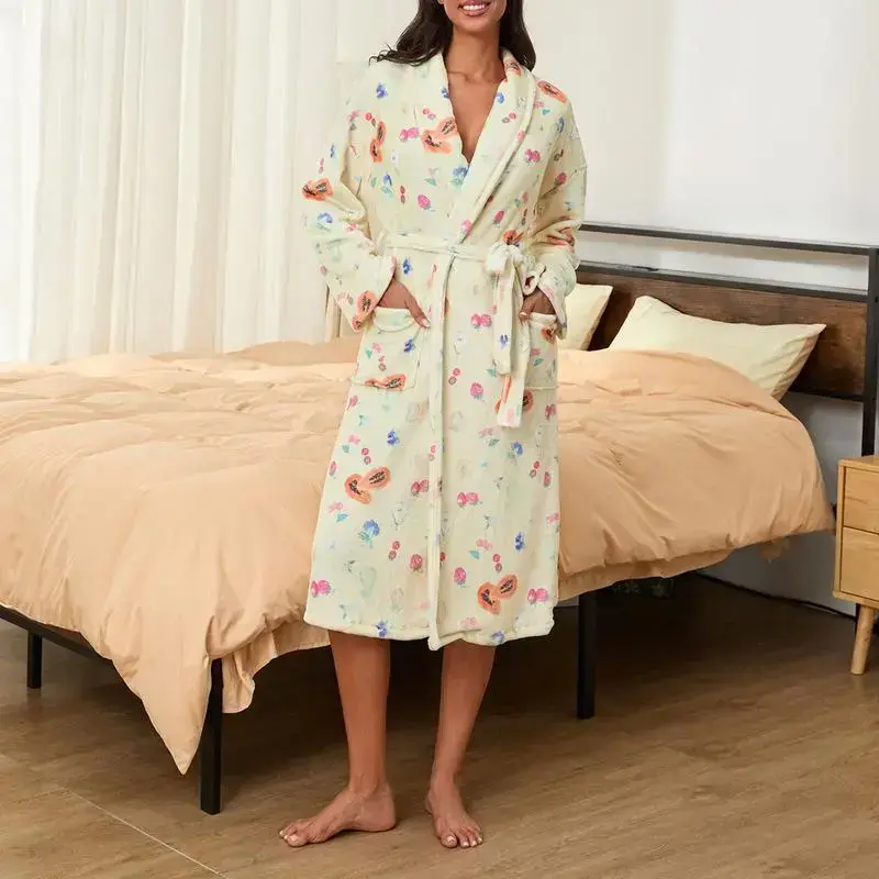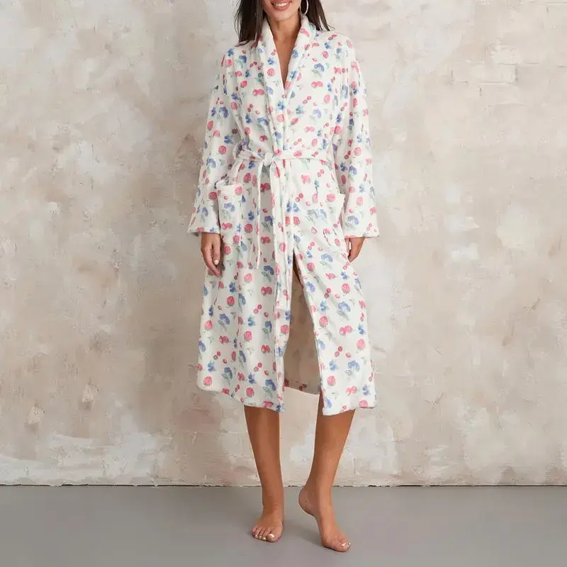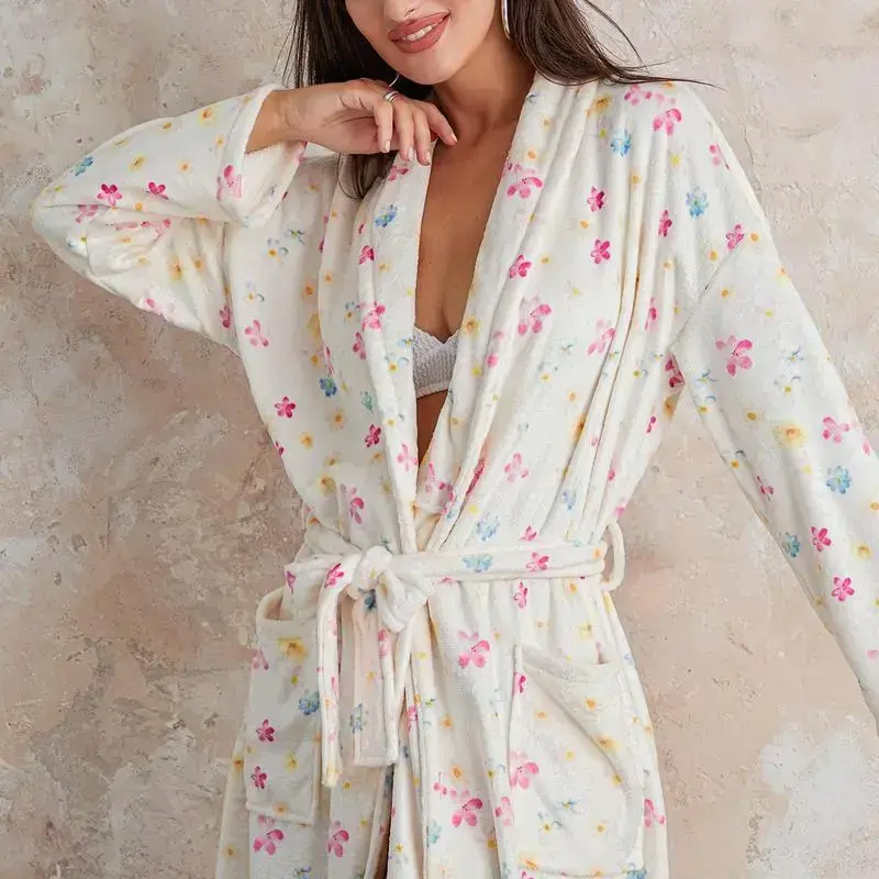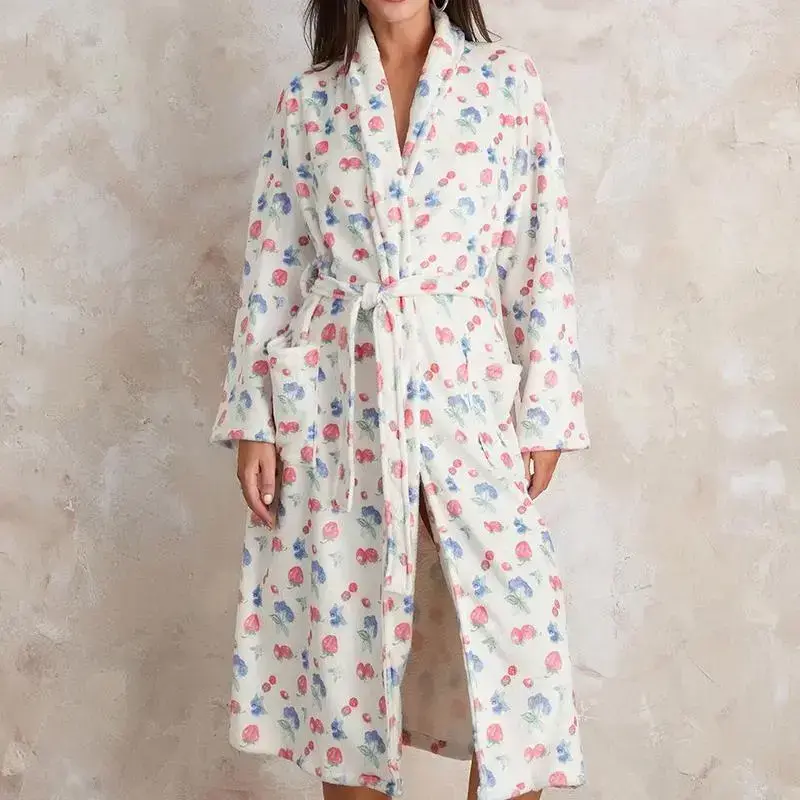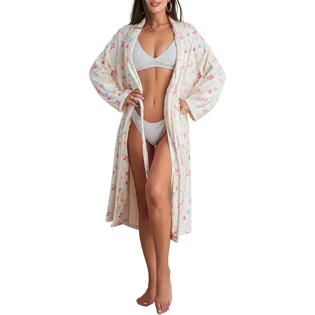 Women Dressing Gown Flannel Robe, Floral Print Shawl Collar Bathrobe for Hotel Spa Party Kimono Robe with Belt, Ladies Clothes for Indoor Outdoor Wear, Ladies Clothes for Daily Wear