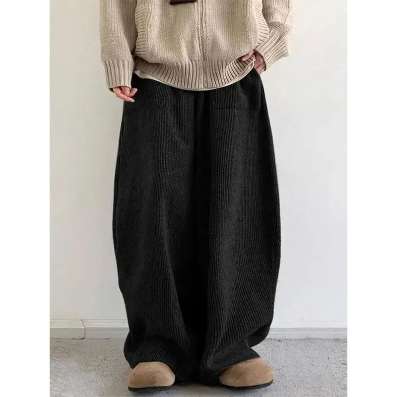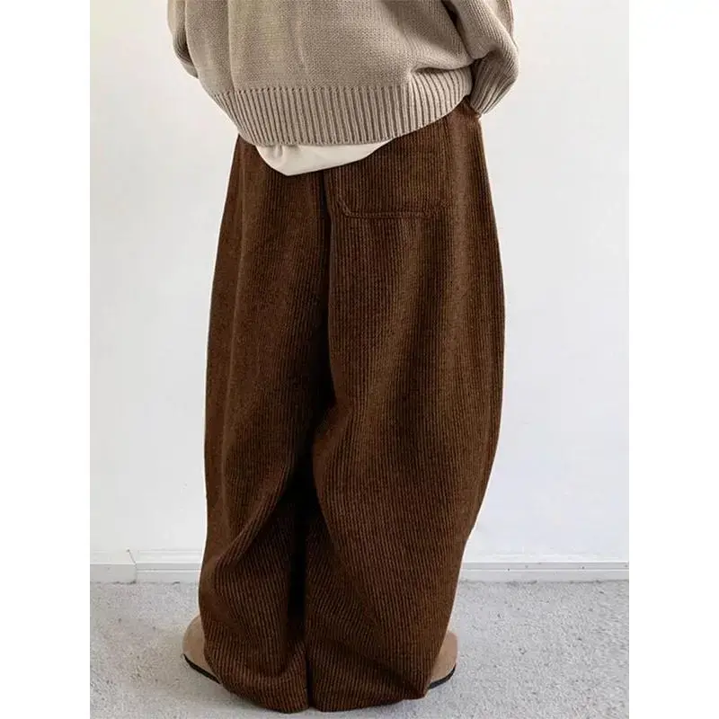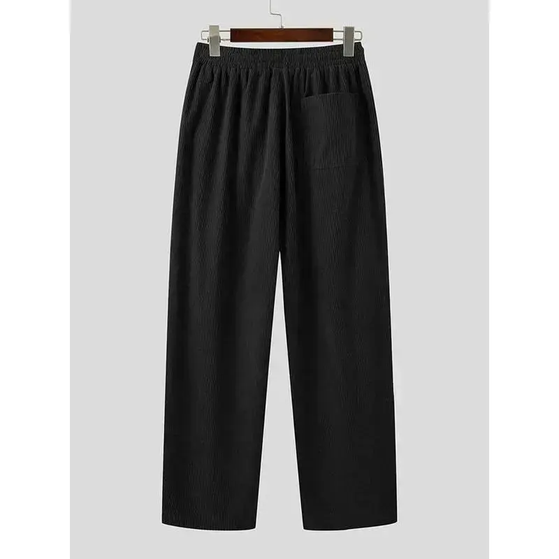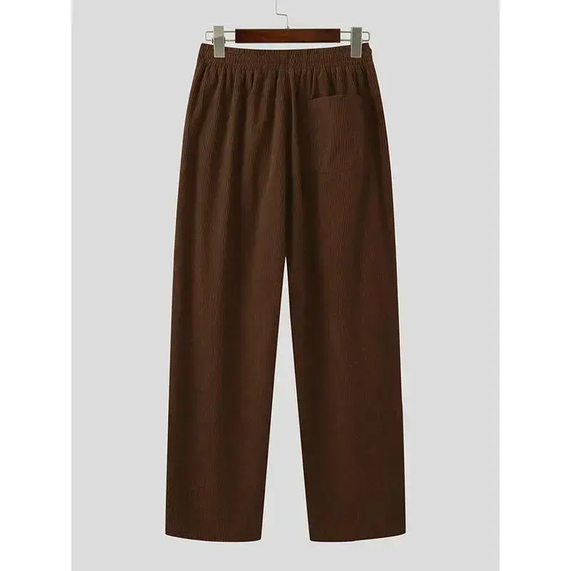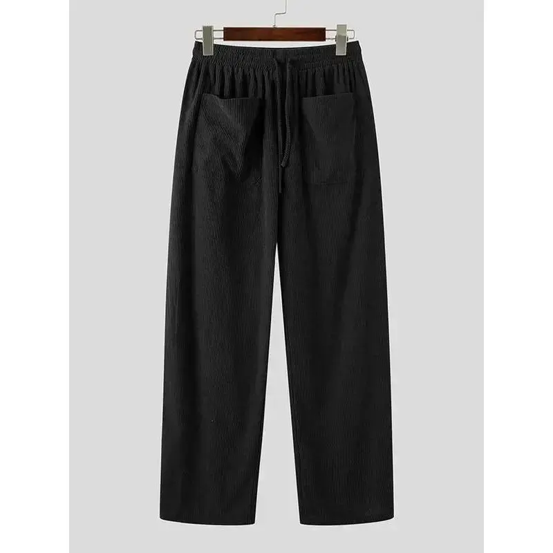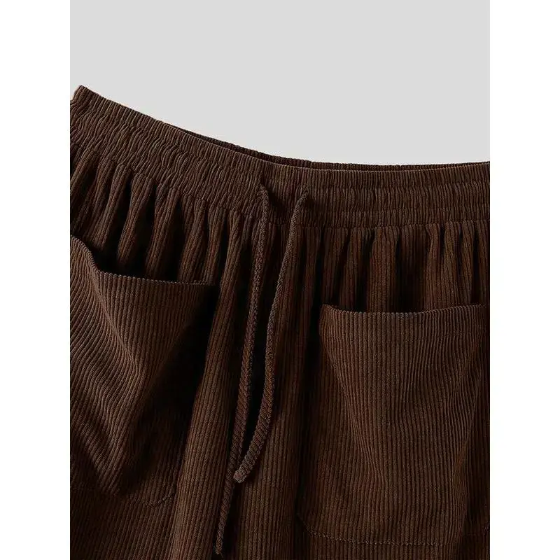 Men's Solid Color Drawstring Waist Corduroy Pants, High Stretch Loose Casual Comfy Pocket Wide Leg Trousers for Daily Wear, Men's Bottoms for All Seasons