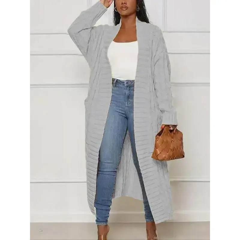 Women's Solid Color Textured Drop Shoulder Pocket Longline Cardigan, Casual Open Front Long Sleeve Knitwear for Fall & Winter, Women's Knit Clothing for Daily Wear, Baggy Cardigans for Women, Womenswear, Comfy Fabric