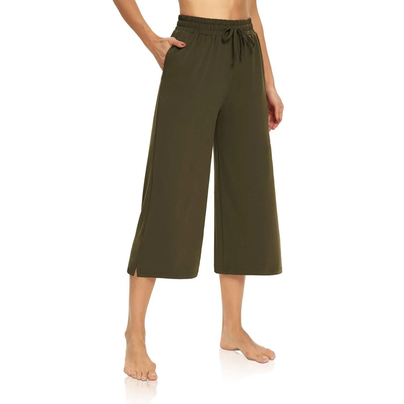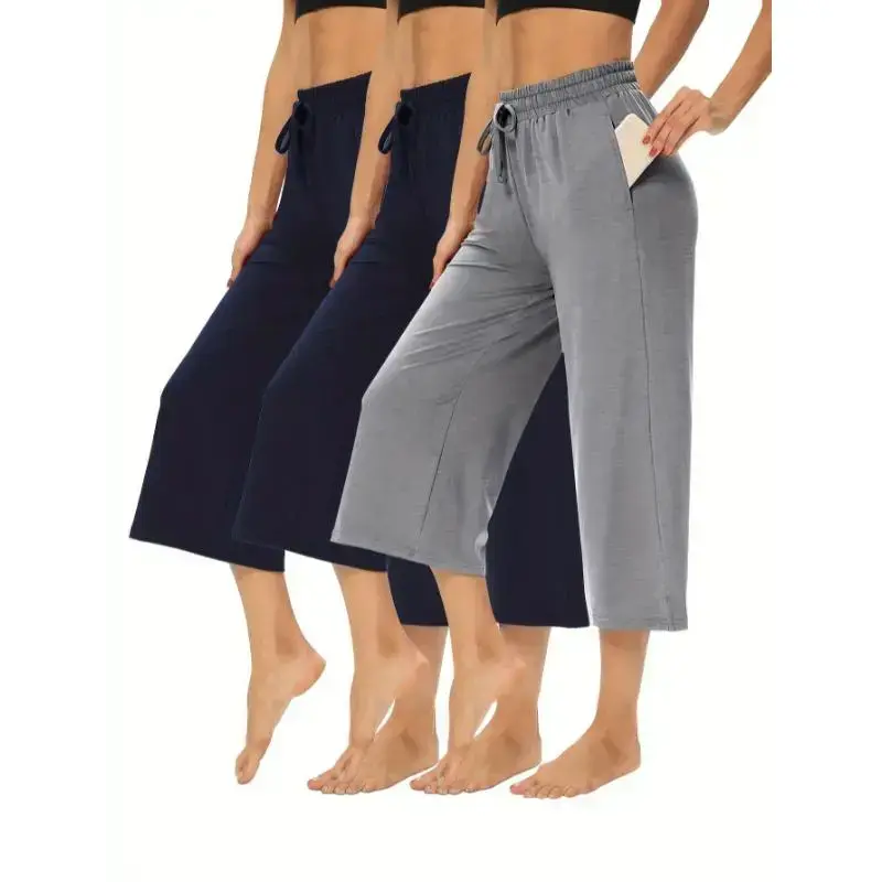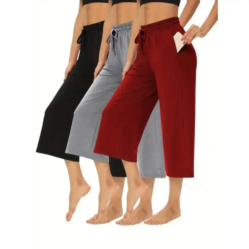 3pcs Drawstring Wide Leg Capri Pants, Women's Loose Fit Athletic Yoga Pants With Pockets, Casual Comfort Sports Cropped Trousers For Outdoor Fitness Training