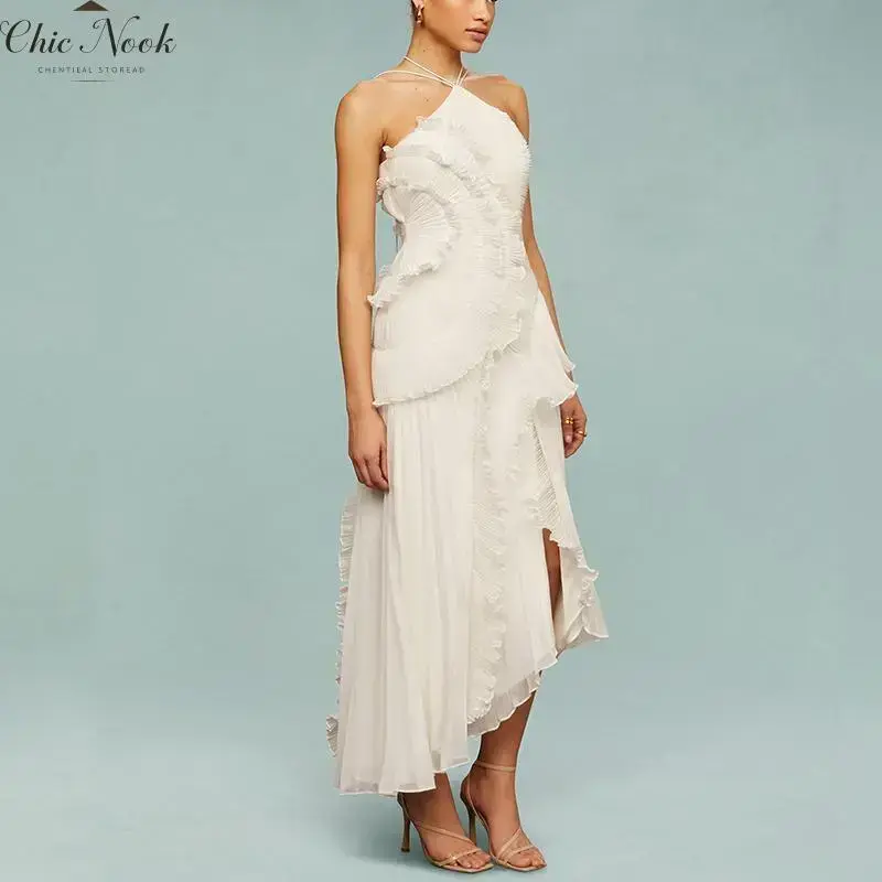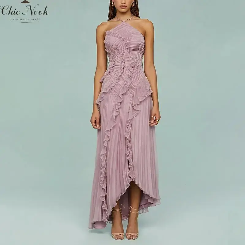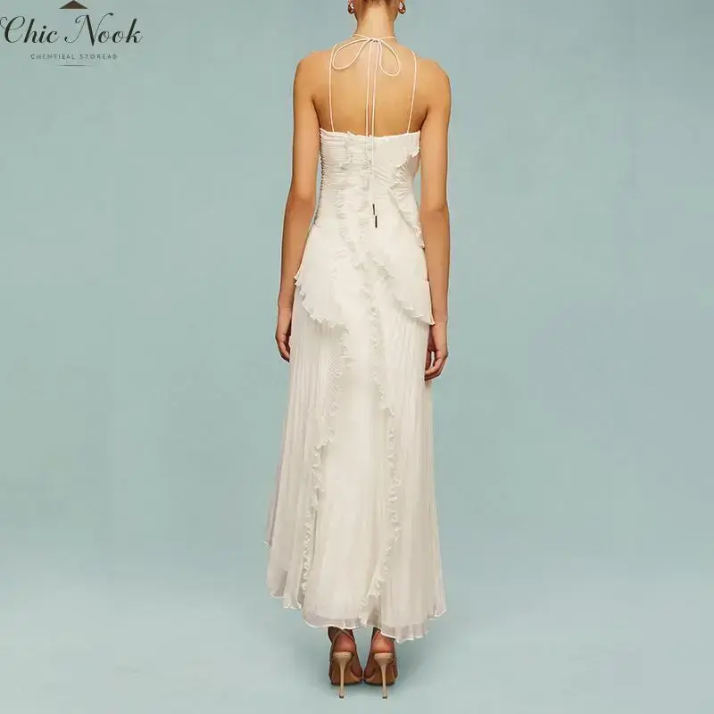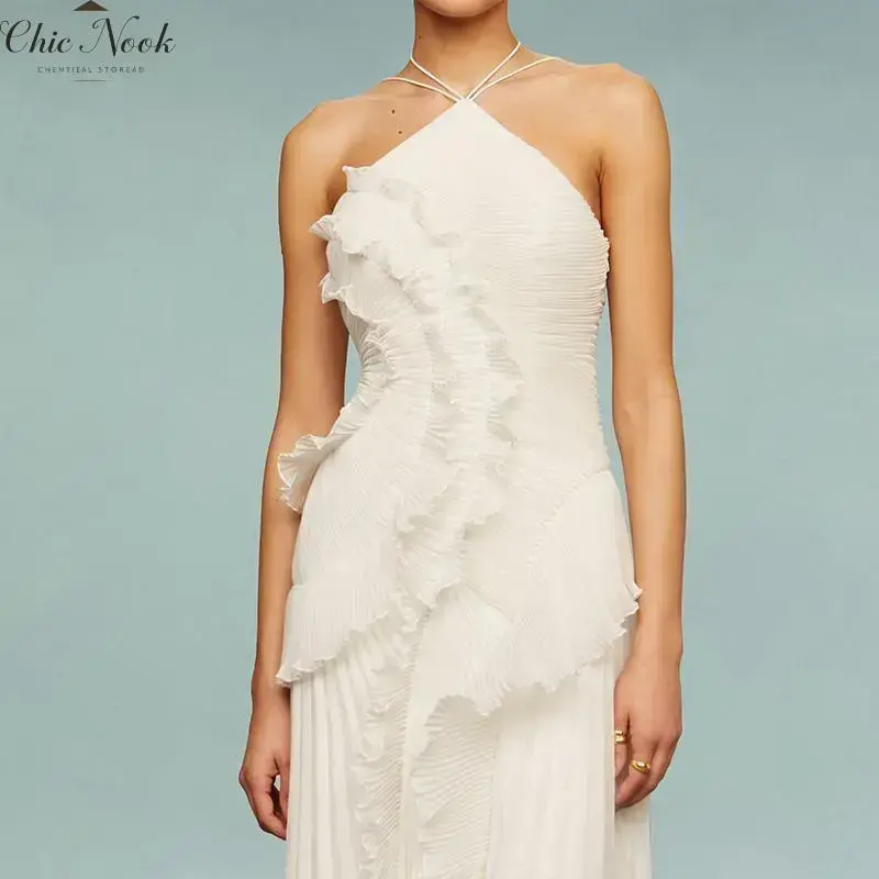 Women's Ruffle Halter Dress Sleeveless Solid Color Long Flowy Dress Summer A-Line Dress